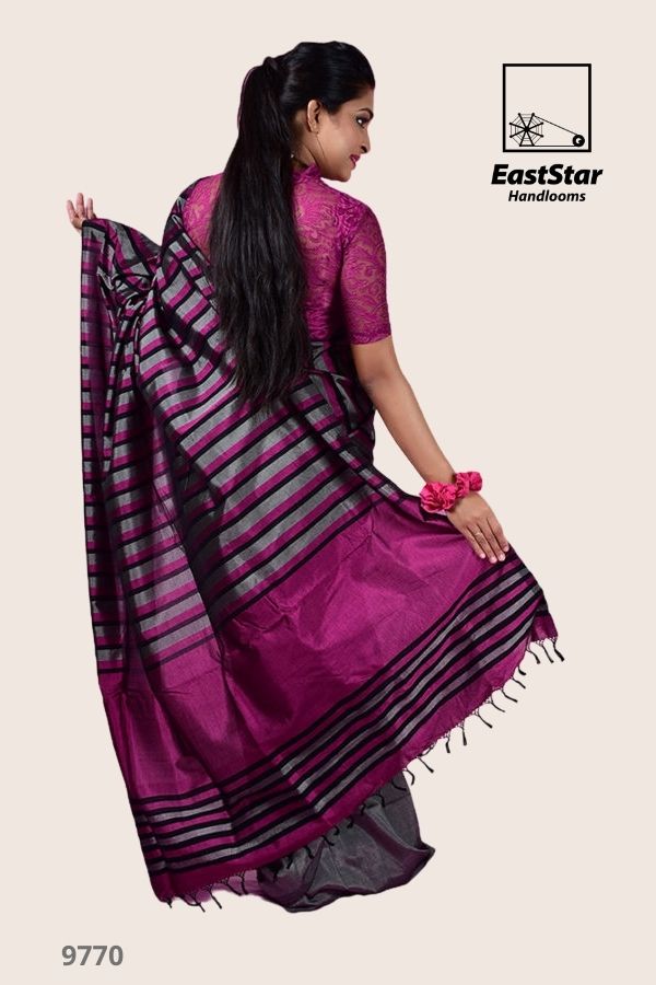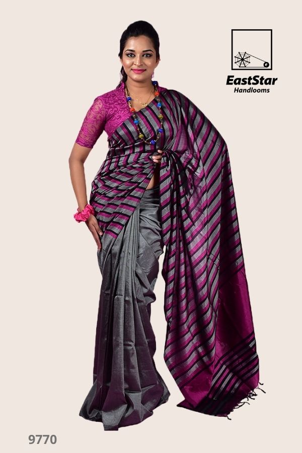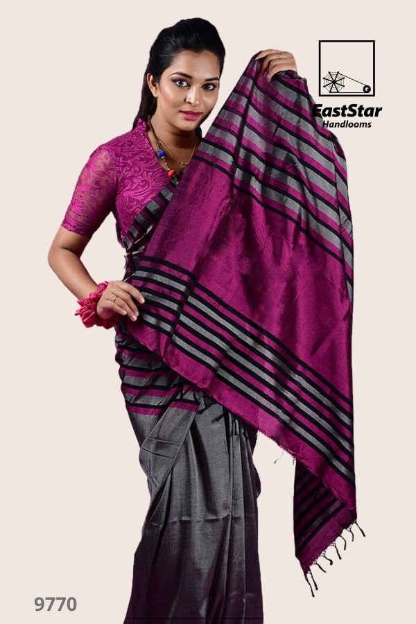 Bring out the fashionista in you by wearing this extravagant designer Handloom silk saree. The shiny silk fabric and the Ash & Magenta makes it an instant hit at any party. Notice the lovely colors on the full body of the saree, that seems to make it Rich look of the saree. It even comes with a blouse piece in Magenta to complete your look.