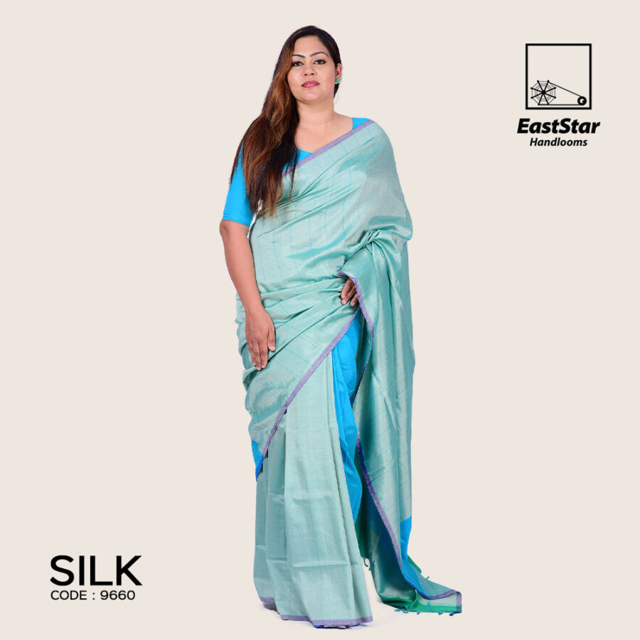 Are you looking to wear something that is elegant and fancy look too? Just have a glance of this Silk Handloom in Green saree and you are surely going to fall for it. The entire saree is Green with small Border and no any other embroidery on it. The fine saree comes with Plain colors Pallu. The saree gives a lavishing look with Blue with Stripes blouse on it. Best for wedding wear & special festivals or occasions.