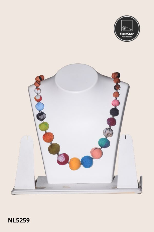 Want to give yourself an elegant look to this Session? Then Choose this unique and special neck piece from East Star Handlooms. This is a modern collection of Handloom fabric with Cotton Fabric design pendant and unique style earrings has been used to give a modern & elegant look. It’s crafted and finished beautifully by our expert Rural Women. This can be used with any kind of dresses especially with Handloom sarees!