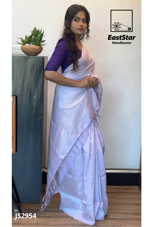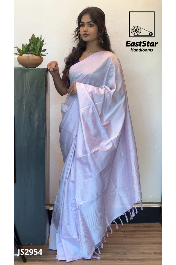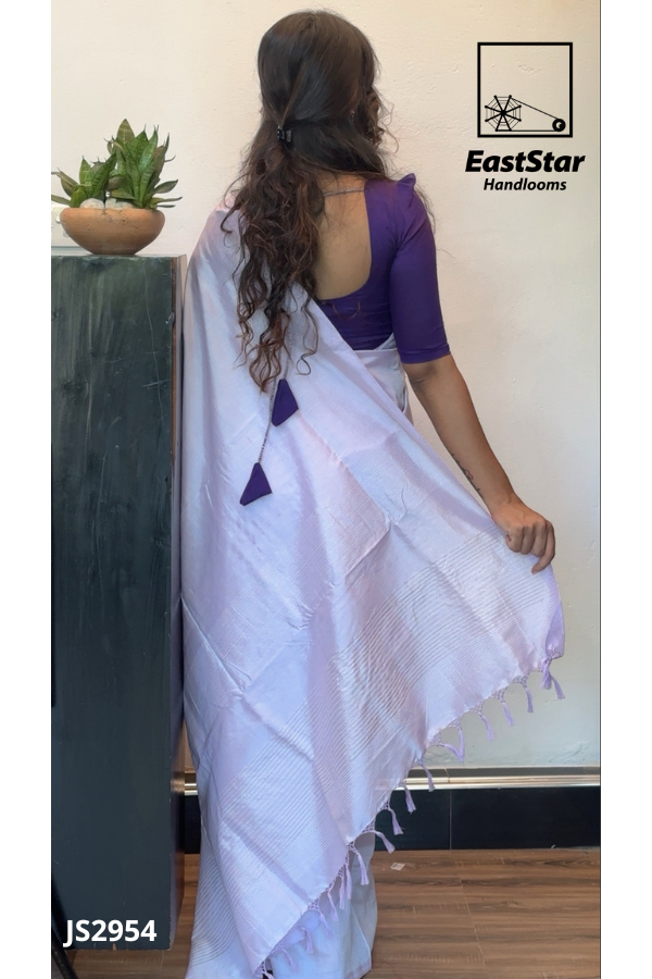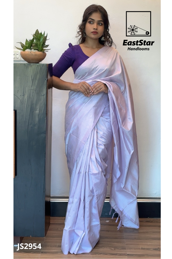 Elevate your elegance with the EastStar Handlooms Lavender Saree, paired exquisitely with a Dark Purple Blouse. This stunning ensemble is more than just clothing; it is a statement of grace and sophistication. The light lavender saree beautifully complements the rich hue of the dark purple blouse, creating a look that is both timeless and modern. Ideal for any occasion, this saree promises to enhance your presence with its unique allure. Step into a world of handcrafted luxury and redefine your wardrobe with the JS2954 EastStar Handlooms Saree, styled against a chic wooden floor and a serene plant pot setup.