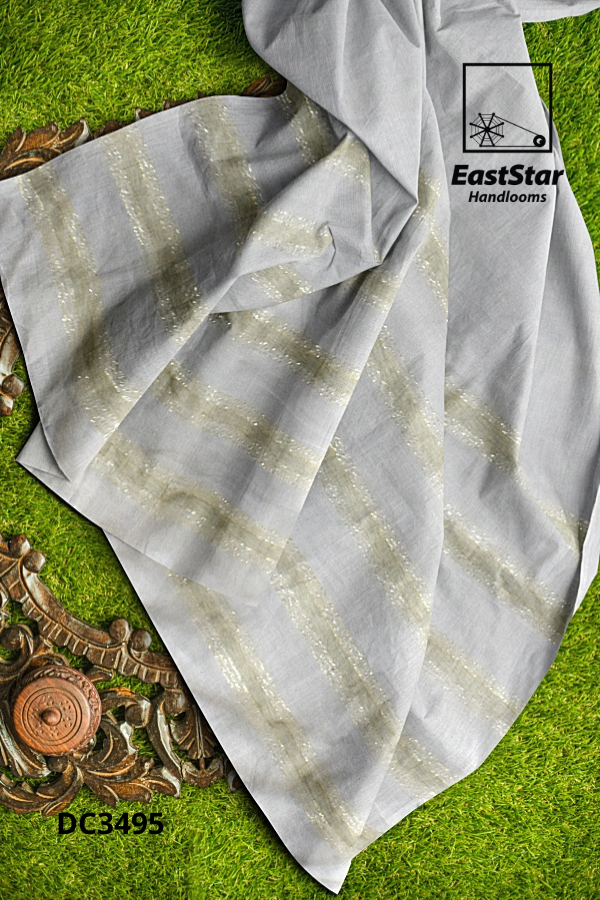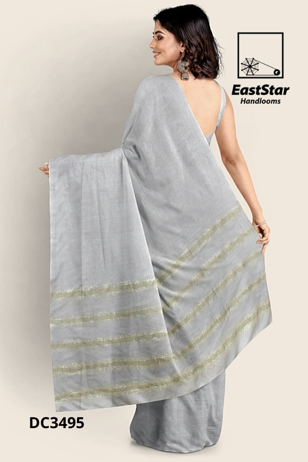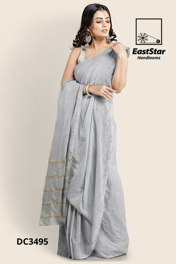 Discover quiet luxury in the Light gray handloom saree EastStar Handlooms DC3495—a gold pallu light gray saree that shimmers with every step. Handwoven in soothing gray with crisp front pleats, it drapes over the left shoulder and finishes with narrow, horizontal gold bands along the lower pallu for a refined handloom gray saree gold border. The coordinated light gray saree sleeveless blouse completes a versatile gray saree blouse set, effortlessly styled with silver jhumkas and bangles for weddings, soirées, or elevated workdays. Buy light gray handloom saree elegance now—Order gray saree blouse set DC3495 and Buy gray saree gold pallu chic from EastStar Handlooms for a look that feels timeless yet unmistakably modern.