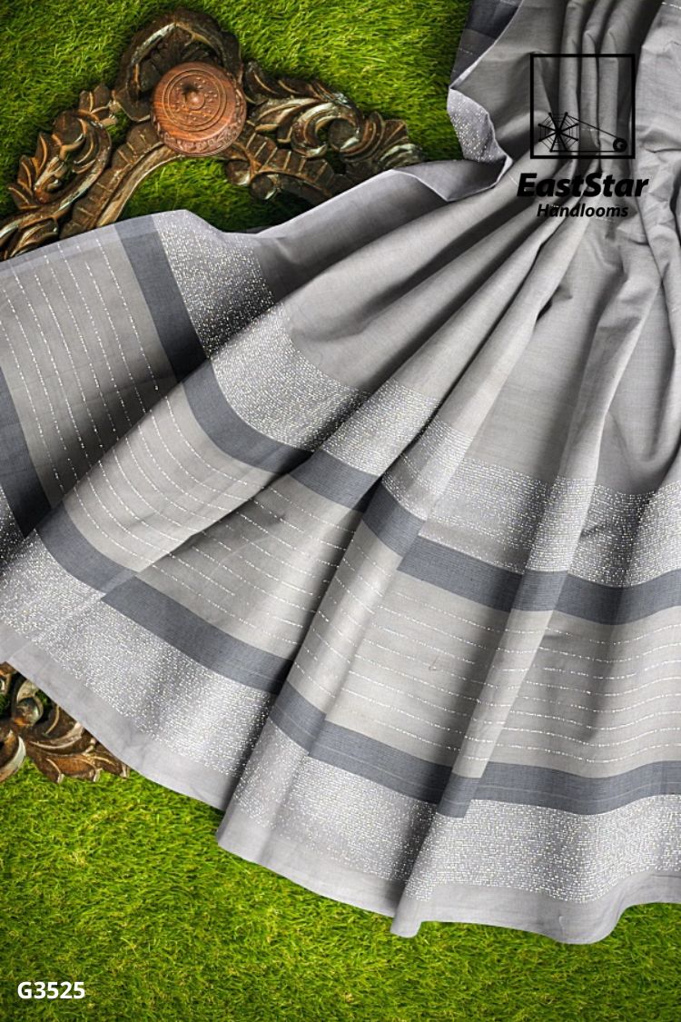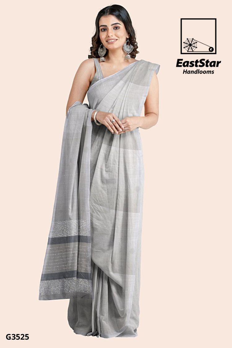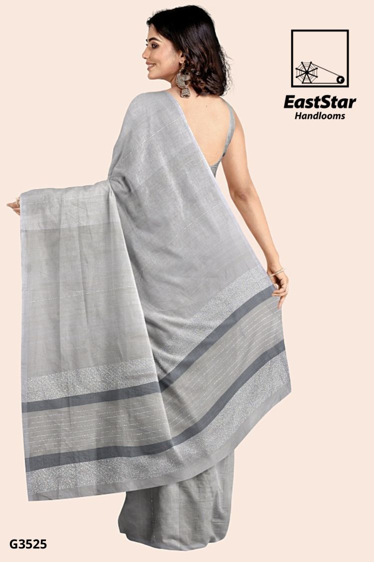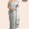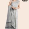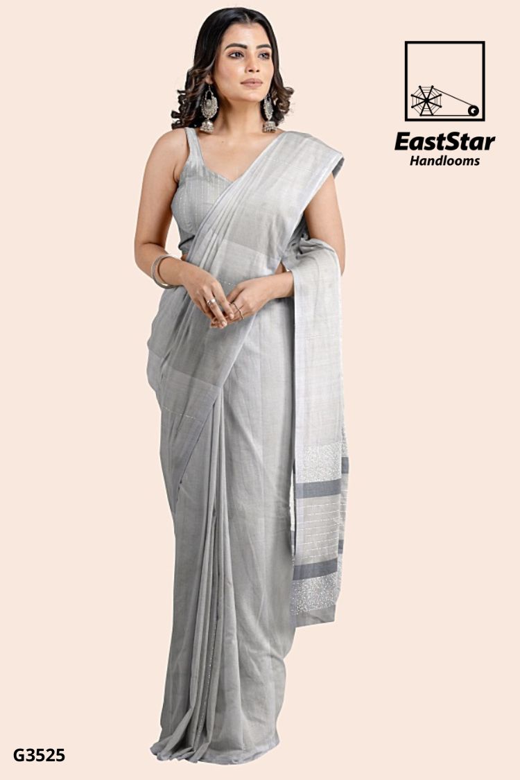 Step into elegance with our graceful light gray saree, a perfect blend of tradition and modern style. Crafted with a subtle pattern and accented by a shimmering border, this saree offers an elegant appearance fit for formal occasions. The ensemble is completed with a matching sleeveless blouse and intricate silver earrings that add a touch of sophistication. Whether you are attending a formal event or seeking a timeless addition to your wardrobe, this ensemble promises to make you stand out. Discover the allure of our shimmering border saree with a chic style statement. Order your elegant light gray saree online now and elevate your fashion game today.