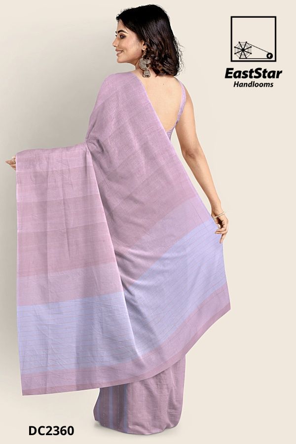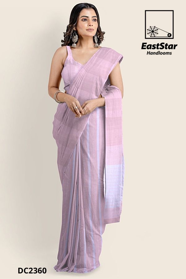 Embrace elegance with our Pinkish Lavender Saree, featuring a graceful drape and intricate striped pattern. Crafted from soft fabric, this saree is paired with a matching sleeveless blouse, perfect for any occasion. The ensemble is elevated with large, silver earrings and a bracelet, exuding timeless sophistication. Ideal for making a serene yet confident statement, this saree is a must-have addition to your wardrobe. Order your elegant soft lavender saree online today!