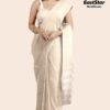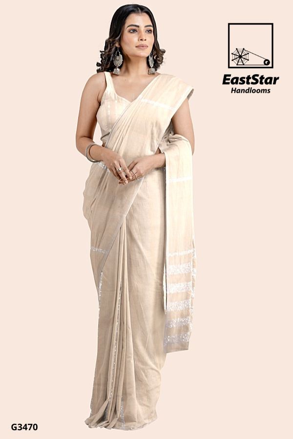 Embrace elegance with our Light Beige Shimmer Saree Collection. This exquisite saree, adorned with lustrous metallic stripes, exudes sophistication and grace. Paired with a chic, sleeveless blouse, it creates a seamless blend of traditional charm and modern flair. The subtle shimmer and intricate design make it the perfect choice for any occasion that demands elegance. Complete with large silver earrings, the overall look is poised and refined. Elevate your style with this luxurious ensemble and make a timeless statement. Experience the fusion of tradition and modernity by ordering your metallic striped saree and sleeveless designer blouse set online today.