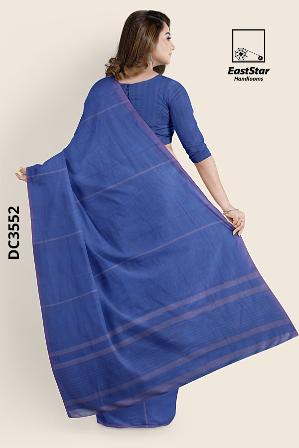 Elevate everyday elegance with this lightweight semi sheer solid blue saree by EastStar Handlooms, woven for airy comfort and a fluid, graceful drape. A minimal border in faint pinkish-lavender accents the solid body, while subtle horizontal stripes at the lower pallu add a refined handloom touch—making it the handloom lightweight blue casual saree you’ll reach for on busy days, travel, and effortless evenings. Style it with the matching short-sleeved blouse, delicate earrings, and a slim bracelet for a polished, modern look that moves from desk to dinner. If you\’re seeking a lightweight semi sheer blue saree or a minimal border blue saree by EastStar Handlooms, this solid blue saree with border is your pick—buy lightweight blue solid saree today and order this semi sheer blue saree to refresh your wardrobe.