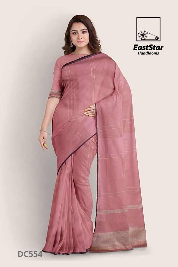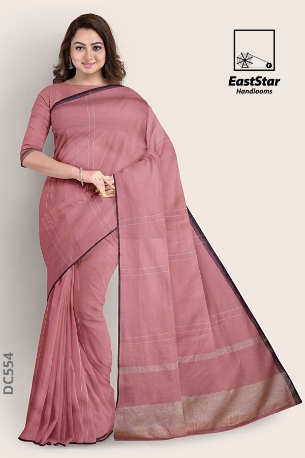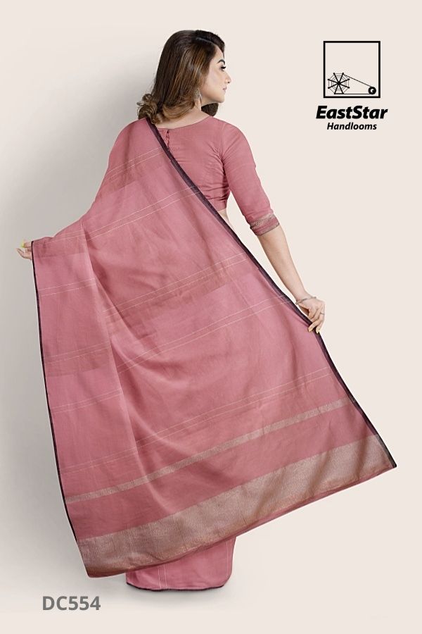If you are looking for a fine outfit for work, this is another stunning piece! The East Star handloom cotton saree is woven with Plain with Gold lines, but intricate motifs all over the body. This Peach of the saree completes the look. Wear it with handmade Jewelry and sandals to ace the perfect board room look. Blouse color is Peach as it\’s Shown in the Picture.