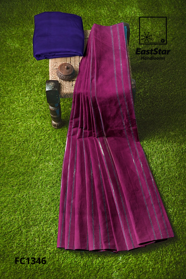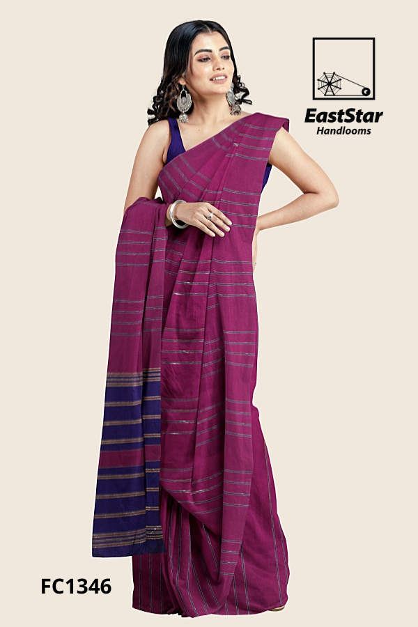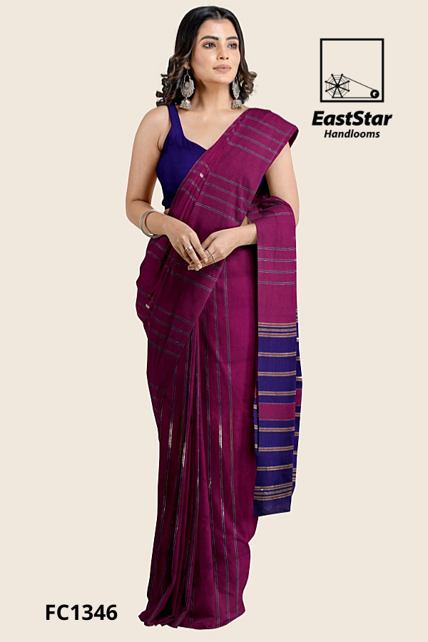 Meet the Magenta striped handloom saree EastStar Handlooms FC1346—an artisan-crafted statement in rich plum with fine metallic stripes that shimmer with every step. This navy pallu gold striped saree by EastStar Handlooms frames the drape with deep indigo and alternating gold and maroon bands, delivering a bold, contemporary contrast. Handloom-soft, lightweight, and elegant to drape, it turns weddings, receptions, and festive evenings into unforgettable entrances while pairing beautifully with a sleek blouse and silver accents. Buy magenta handloom striped saree, order this plum metallic striped saree—the metallic striped magenta handloom saree you\’ll treasure: a plum saree with navy pallu, a magenta saree with gold stripes; buy navy pallu festive saree now.