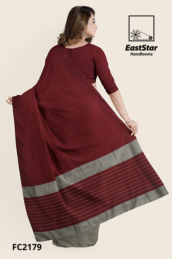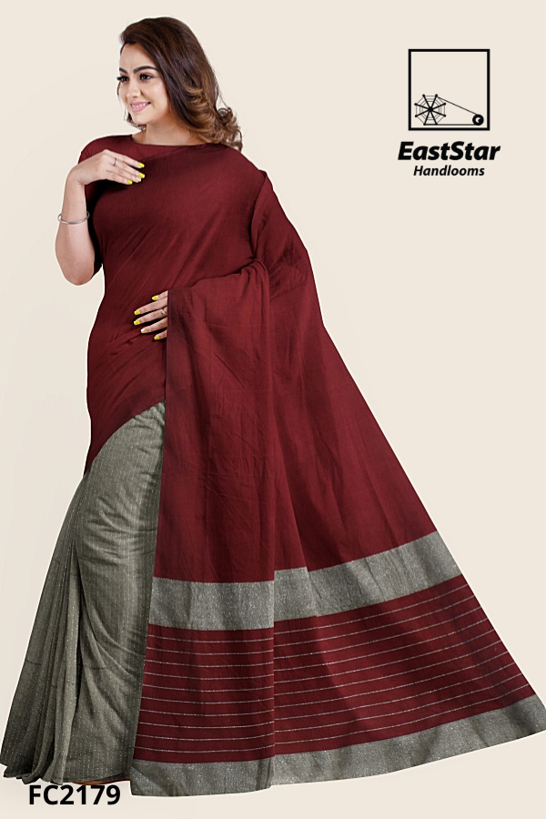 Step into effortless elegance with the Maroon gray border sari EastStar Handlooms FC2179, a refined maroon pallu sari with a sleek gray border that frames every drape. The pleated skirt reveals sophisticated gray with fine white pinstripes, creating a striking burgundy sari with pinstripe pleats that moves fluidly from desk to dusk. Whether you are dressing for festivities or power meetings, this maroon sari with gray border pairs beautifully with silver jhumkas and a half-sleeve blouse, while the maroon pallu sari striped border adds modern definition. Buy maroon gray border sari and buy burgundy pinstripe pleated sari with confidence from EastStar Handlooms today—Order maroon pallu border sari FC2179 now and let your style speak in timeless, camera-ready sophistication.
