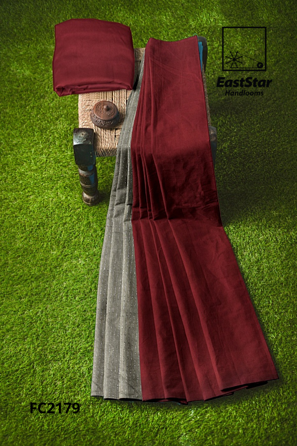 Fabric Pure Cotton Length and Width 6.15 Meters, 1.19 meters Blouse Piece 1 meter in maroon Description East Star presents this airy and lightweight Handlooms saree for those special occasions. This natural fabric settles around you as if they are part of your own skin. This Coffee Blue & Grey Combination and woven for those who have a classy taste