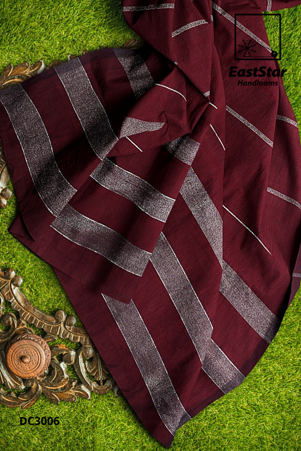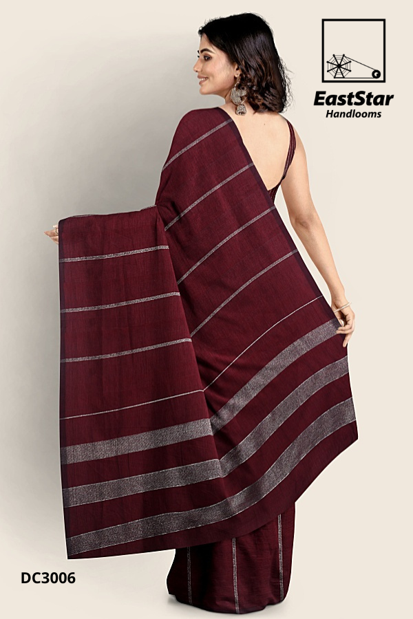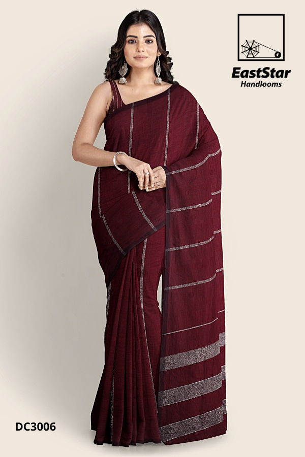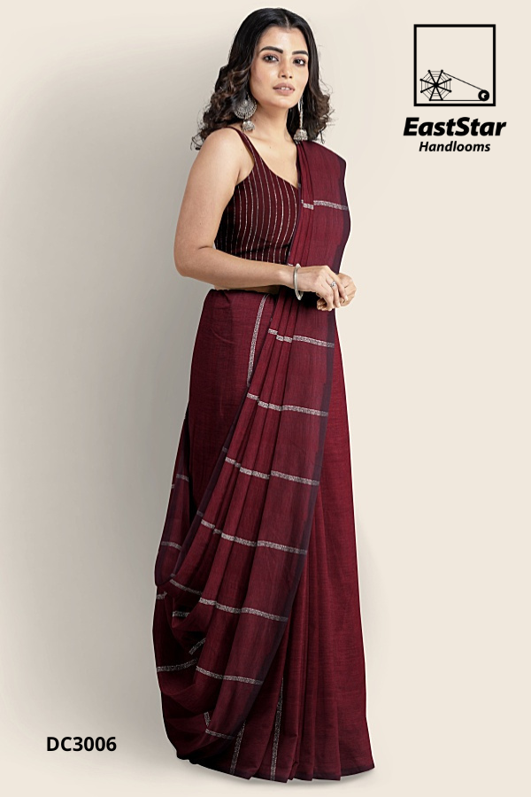 Drift into elegance with the EastStar Handlooms maroon saree, meticulously crafted to exude timeless beauty. This exquisite handloom piece features metallic silver lines that shimmer subtly across the maroon canvas, creating an elegant simple fall and drape. Adorn yourself with intricate earrings and a silver bangle to elevate your look, while loose waves add a touch of modern flair. Embrace the artistry of EastStar Handlooms and redefine sophistication with every wear. Order now to experience tradition with a contemporary twist.