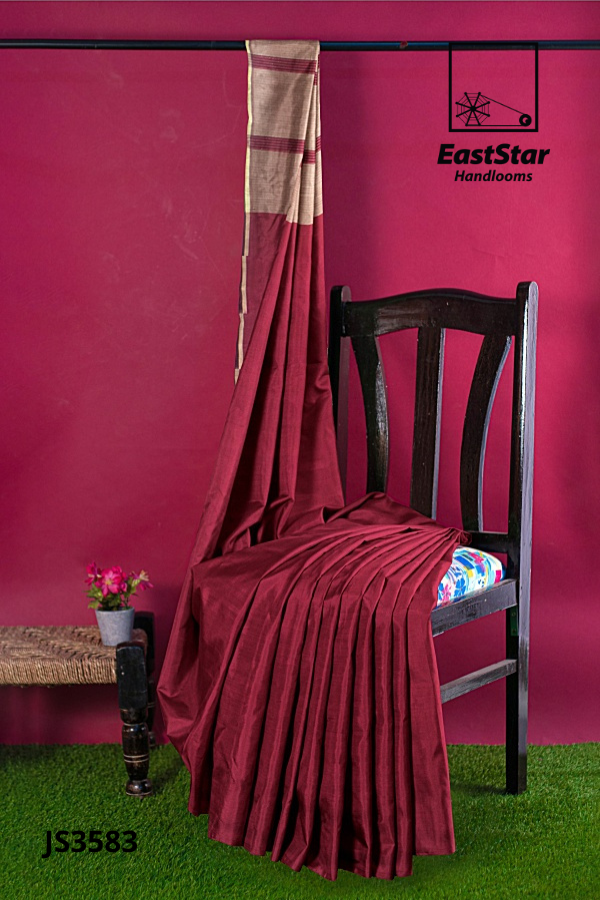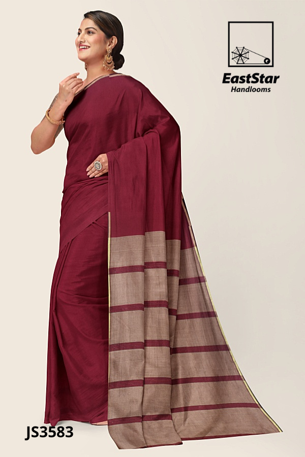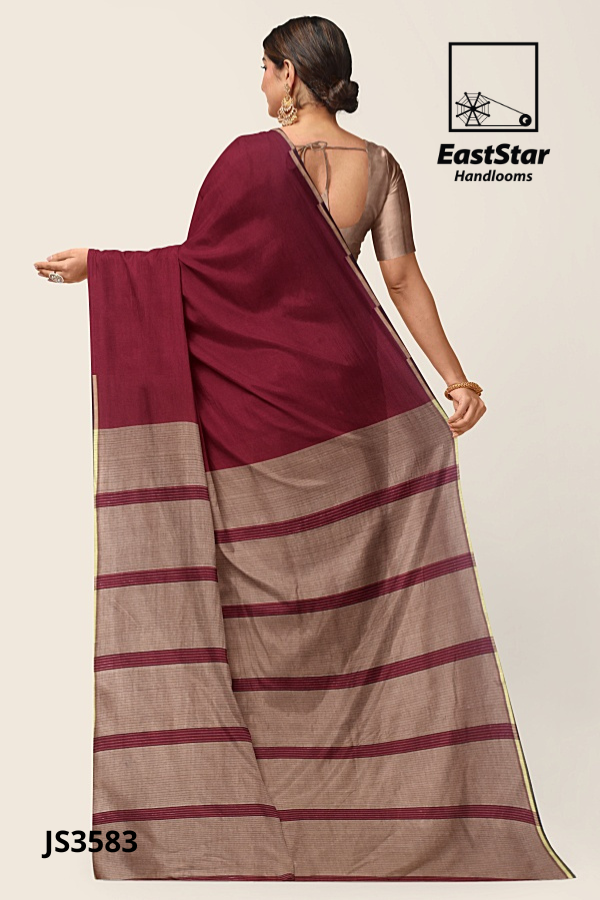 Elevate every celebration with EastStar Handlooms JS3583, the burgundy beige saree crafted in deep maroon that drapes with effortless poise. Its taupe-beige panel pallu carries evenly spaced maroon stripes and a refined light-gold edge – an exquisite striped pallu saree from EastStar Handlooms, and a maroon handloom saree with a striped pallu that blends tradition and modern polish. This maroon handloom party saree pairs beautifully with a satin-like taupe blouse and shines for weddings, receptions, and festive wear. Buy burgundy festive wear saree online – order this beige striped pallu saree now; your gold edged striped pallu saree and burgundy saree with beige panel pallu to treasure from EastStar Handlooms.