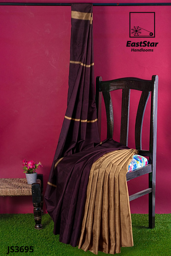 Unveil timeless grace in the MaroonJS3695 EastStar Handlooms saree, handwoven with a deep plum body framed by broad beige-gold borders for regal poise. A solid beige-gold skirt panel streamlines your drape, while the Beige striped pallu EastStar Handlooms sari cascades in bold horizontal blocks—uniting classic craft and modern polish for weddings and grand festivities. This Maroon gold border EastStar Handlooms saree is the definitive broad border wedding saree and traditional festive burgundy border saree for connoisseurs of heritage style. Buy burgundy gold border saree now—order striped pallu burgundy saree and buy traditional festive wedding saree elegance from EastStar Handlooms.