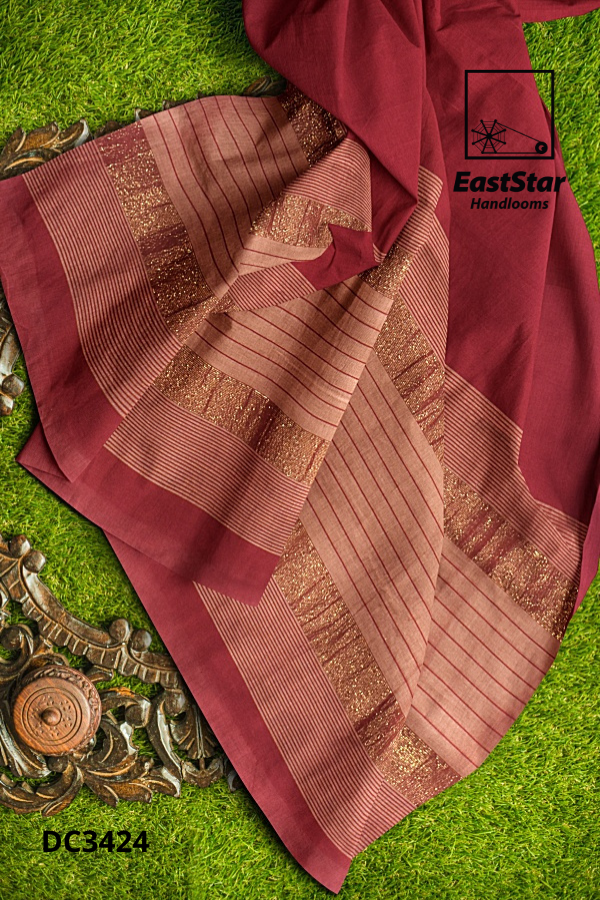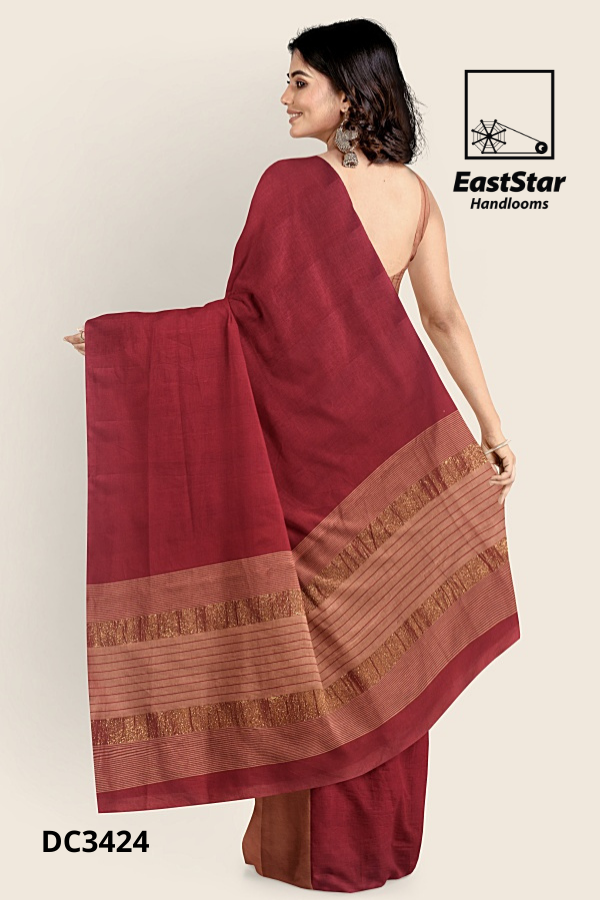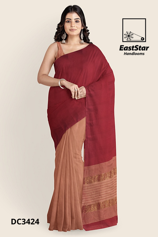 Elevate every celebration with the Maroon pallu two tone sari EastStar Handlooms, code DC3424, handloom-crafted for a graceful drape and lasting comfort. A rich maroon pallu flows across warm tan-peach pleats, finished with a wide maroon and gold-toned border featuring glittery bands and fine pinstripes for luminous detail. Light, elegant, and effortlessly versatile, this maroon tan handloom sari flatters from day to dusk and pairs beautifully with silver accents for a refined, modern, timeless finish. Buy maroon pallu peach sari today and order maroon gold border sari with confidence from EastStar Handlooms; also explore our Gold border maroon peach sari EastStar Handlooms, maroon pallu gold border sari, two tone maroon pallu sari, Maroon tan pleated sari EastStar Handlooms DC3424, and tan peach pleated pallu sari, and Buy two tone handloom sari now.