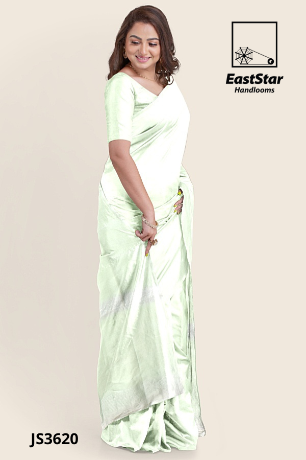 Breathe elegance into every occasion with EastStar Handlooms JS3620, a pastel mint-green handloom silk saree with a glossy finish. The pastel mint-green color and subtle woven texture, highlighted by a faint lighter band near the border, create a serene, modern statement. Its lightweight drape and refined pallu make styling effortless for weddings, receptions, and festive evenings, pairing beautifully with the matching blouse. This glossy mint green silk saree from EastStar Handlooms—Handloom silk saree EastStar JS3620—celebrates artisanal craftsmanship while keeping your look fresh and minimal. Buy mint green silk saree today and Order handloom mint green saree to own a timeless pastel mint silk saree from EastStar Handlooms.