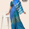 Step into the spotlight with our exquisite Blue Metallic Striped Saree, a masterpiece that beautifully marries traditional elegance with modern flair. This vibrant blue saree, featuring striking metallic silver and turquoise stripes on the border, is sure to captivate at any occasion. The matching blouse enhances the ensemble with shimmering vertical stripes on the sleeves, adding a touch of sparkle. Perfectly complemented by ornate earrings and a floral-patterned ring, this look is your passport to elegance. Order this elegant blue saree online today and redefine your wardrobe with our stylish blue saree design collection.