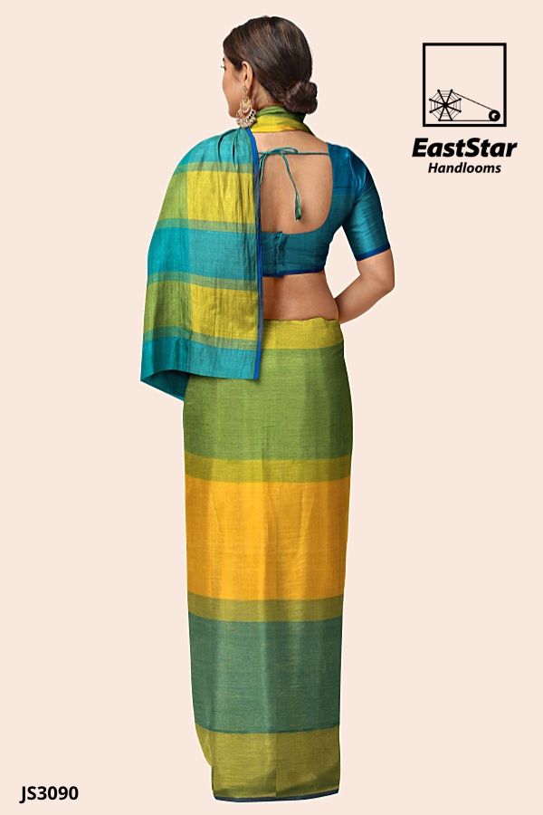 Elevate your elegance with our Vibrant Colorful Saree Collection, where tradition meets modern style. This exquisite saree features a captivating blend of green, yellow, and blue horizontal stripes with subtle checks, set against a bold bright blue blouse for a stunning contrast. Perfectly paired with intricate metal earrings, this outfit captures the essence of timeless charm and contemporary flair. Embrace the beauty of a Stylish Updo and make a striking statement with this Colorful Striped Saree Outfit. Discover the perfect blend of tradition and style with our exquisite daring combinations and purchase your dream saree today, complete with stunning accessories that enhance the magic of every occasion.