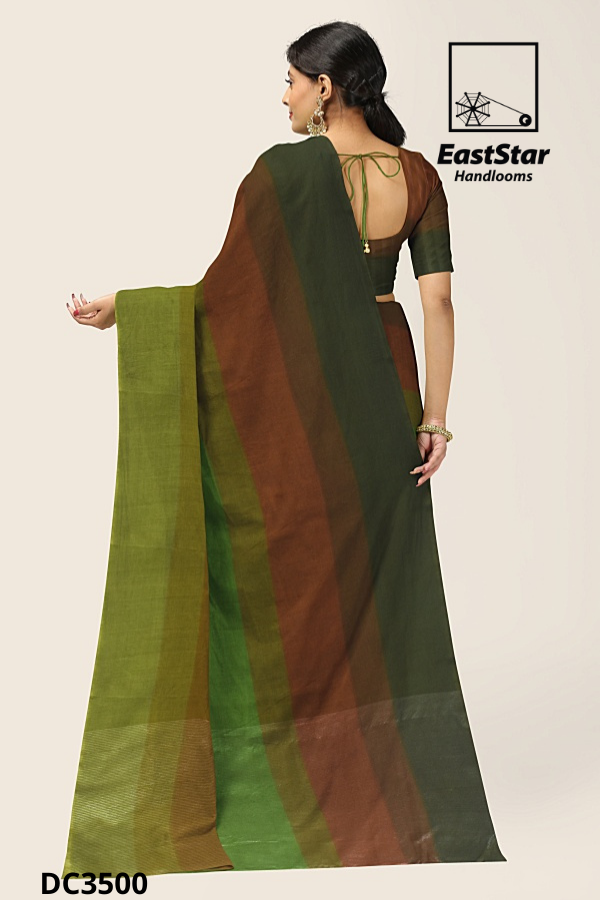 Discover the soul of the forest in this EastStar Handlooms masterpiece, code \”DC3500\”—a Handloom saree earthy green EastStar Handlooms DC3500 featuring broad horizontal bands of forest green, olive, moss, and brown with a refined narrow green border. Neat olive front pleats lead to an olive moss gradient pallu, where alternating dark green, brown, and olive sections move fluidly—an Olive moss gradient pallu EastStar Handlooms saree crafted to flatter. Soft, breathable, and artisan‑loomed, this handloom green brown saree drapes with quiet luxury for weddings, work, or festive evenings—your go‑to handloom earthy tones green saree. Buy handloom green brown saree now—your gradient pallu handloom saree of choice: order the olive moss green saree from EastStar Handlooms and make the narrow border olive pallu saree your signature; the perfect pick when you want a broad bands forest green saree.
