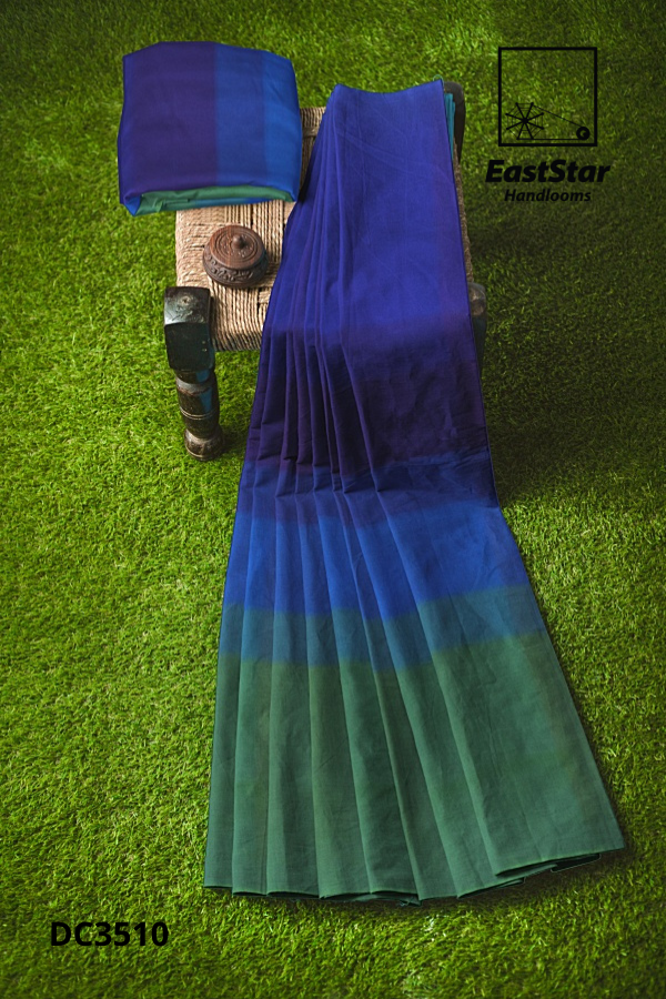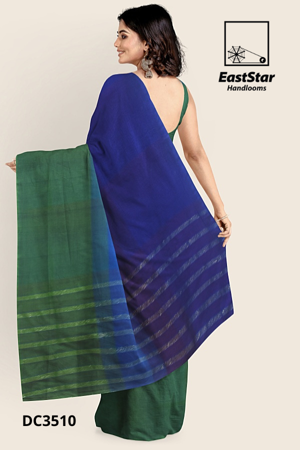 Drape yourself in luminous heritage with EastStar Handlooms DC3510, a cobalt royal blue and green handloom saree that turns every moment into a celebration. The rich royal blue body deepens with indigo tones, while the contrast green pallu and border flow in subtle lighter‑green stripes; crisp pleats reveal elegant blue‑and‑green bands for a poised, modern silhouette. This royal blue green saree by EastStar Handlooms is the blue saree with green pallu you’ll reach for when you want effortless grandeur, from weddings to festive soirées. Buy this blue green handloom saree from EastStar Handlooms today—order the cobalt blue handloom saree DC3510 and embrace the signature Royal Blue Sari Green Pallu EastStar Handlooms allure.