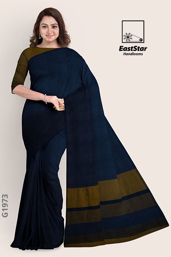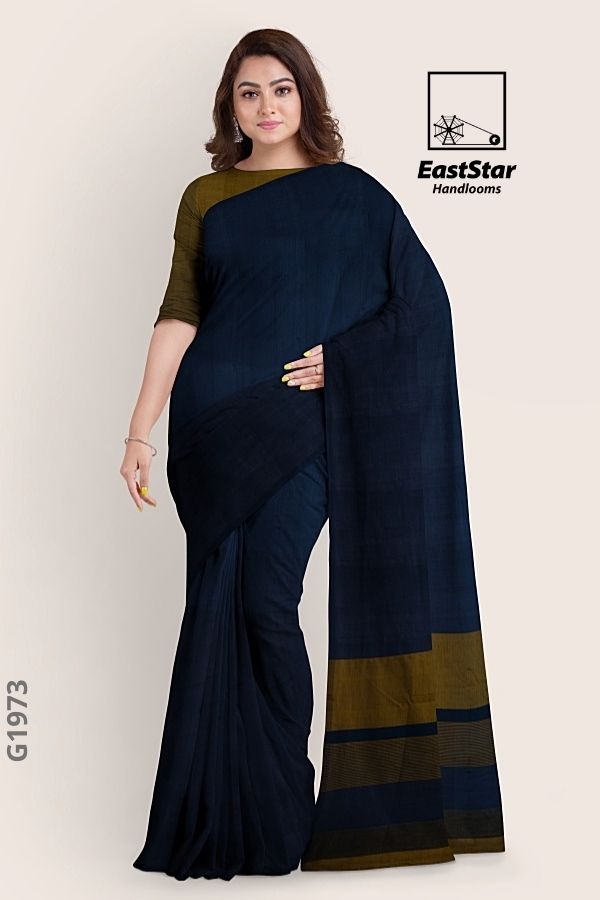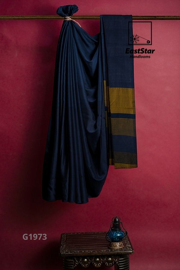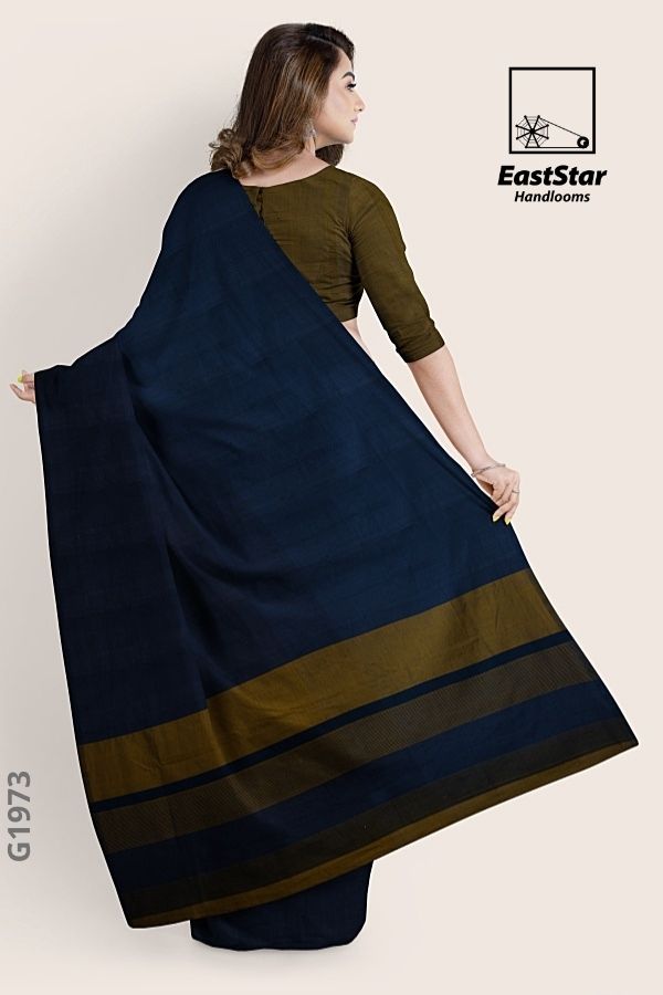 If you are looking for a fine outfit for work, this is another stunning piece! The East Star handloom Glossy cotton saree is woven with Love, but intricate motifs all over the body. This Navy Blue & Yellow of the saree completes the look. Wear it with handmade Jewelry and sandals to ace the perfect board room look. Yellow blouse is as it\’s Shown in the Picture.