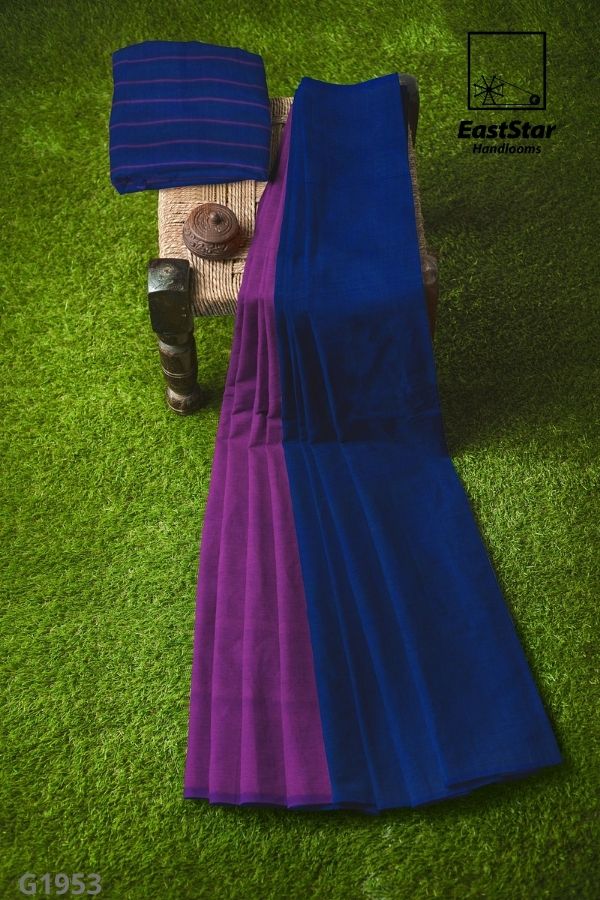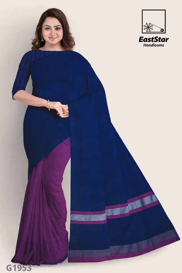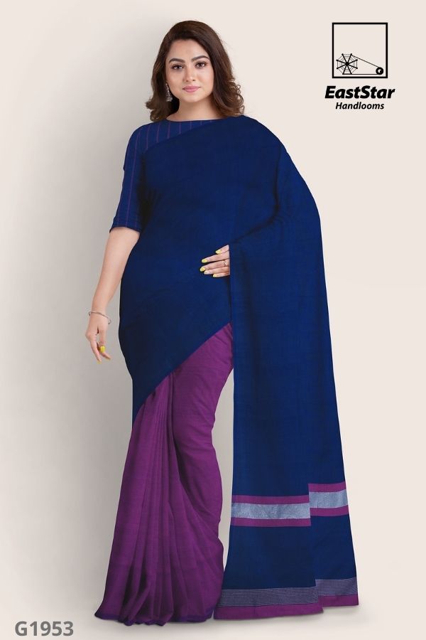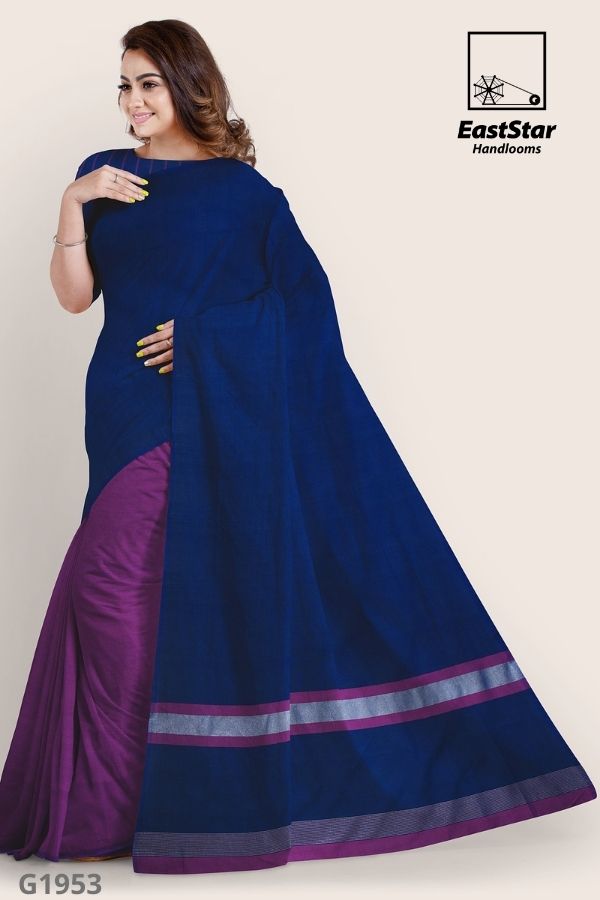 If you are looking for a fine outfit for work, this is another stunning piece! The East Star handloom Glossy cotton saree is woven with Love, but intricate motifs all over the body. This Royal Blue color of the saree completes the look. Wear it with handmade Jewelry and sandals to ace the perfect board room look. Navy Blue blouse is as it’s Shown in the Picture.