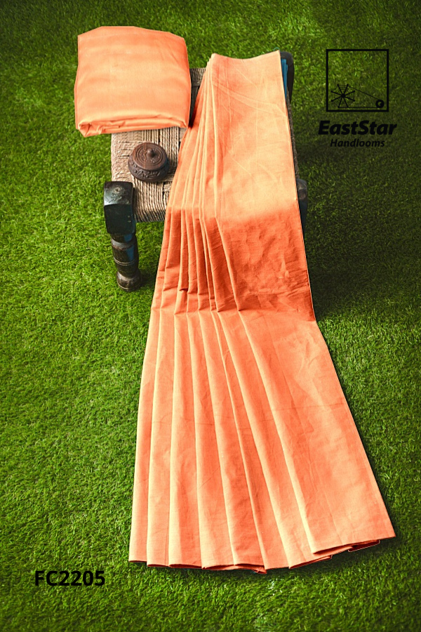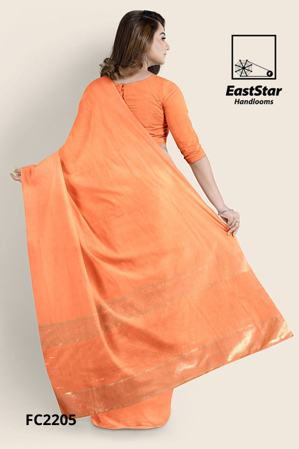 Meet EastStar Handlooms FC2205, the orange saree that whispers luxury with clean knife pleats, a sweeping long pallu, and a refined metallic gold border with a gleaming edge. Light, fluid, and impeccably finished, it includes a matching blouse with a simple round neckline and elbow-length sleeves for effortless, occasion-to-office elegance. Search-friendly and standout, this oange saree gold border EastStar Handlooms icon doubles as your orange saree EastStar Handlooms FC2205 and Metallic gold edge saree EastStar Handlooms, perfect as a orange plain saree or a peach plain saree with pallu for weddings, festivities, or chic everyday wear. Elevate your collection now: Buy orange saree gold border, Buy orange saree long pallu, or Order orange plain saree, and step out in timeless grace.