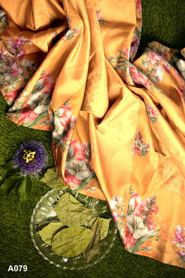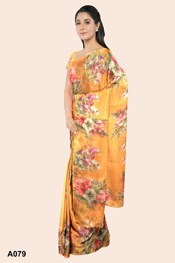 Step into a world of vibrant elegance with our Exclusive Orange Floral Saree, designed to make you stand out at any occasion. Embrace the colors of nature with this Bright Floral Saree Collection, where large, multicolored flowers dance across an orange canvas, creating a stunning visual masterpiece. Perfect for those seeking Colorful Designer Sarees Online, this saree combines traditional craftsmanship with contemporary style. Each drape tells a story of grace and sophistication, making it a must-have for any fashion-forward wardrobe. Explore Multicolored Indian Saree Styles and order your Vibrant Orange Floral Saree Online today, redefining your style with every graceful movement.