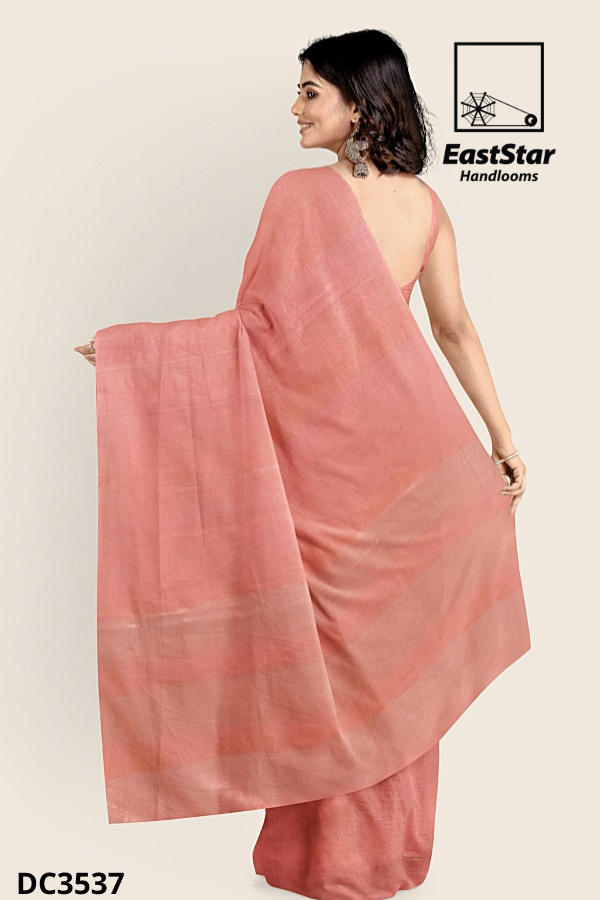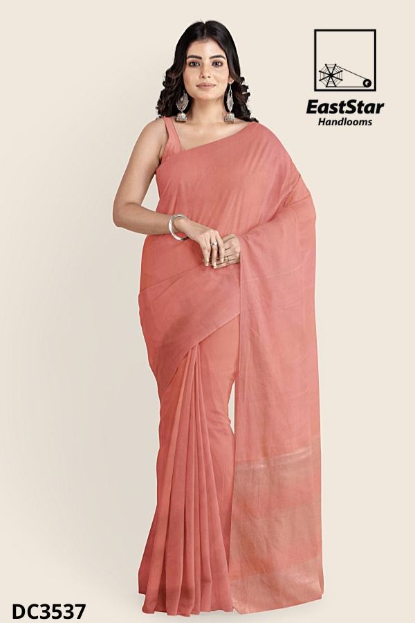 Meet DC3537, the orange peach handloom saree from EastStar Handlooms that whispers modern grace in a soft, solid coral hue. With neatly arranged front pleats, a fluid pallu over the left shoulder, and a sleeveless thin-strap blouse match, this solid peach saree by EastStar Handlooms delivers a refined, plain peach saree look and peach saree styling. Designed for women who love effortless elegance, this soft peach plain handloom saree offers versatile solid coral saree styles and a coral solid color saree look for work, celebrations, and serene evenings. Buy soft peach handloom saree now—Order solid coral plain saree DC3537 orange peach saree from EastStar Handlooms and Buy plain peach saree online to elevate every step with quiet luxury.