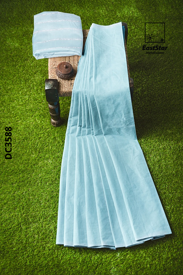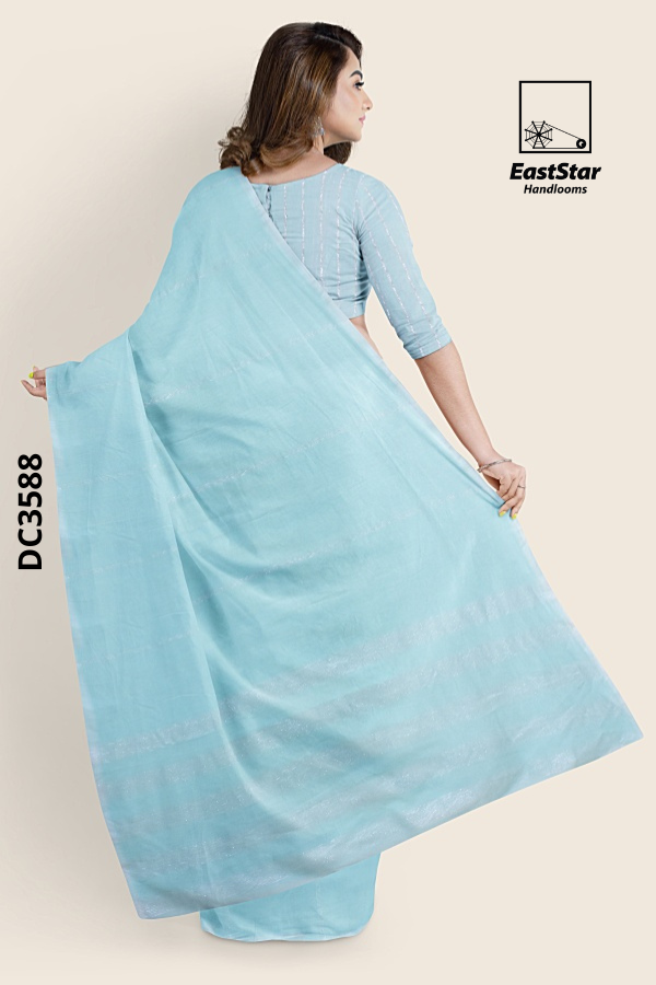 Discover the Pastel blue lightweight saree EastStar Handlooms DC3588 – an ethereal plain aqua drape that moves like air and flatters every silhouette. Fine, subtle shimmer lines grace the lower half and pallu, giving this subtle shimmer pallu saree a refined gleam that transitions effortlessly from daytime charm to evening allure. The coordinated blouse elevates the look with a round neck and elegant elbow-length sleeves framed by thin silver-toned stripes—your perfect elbow length blouse saree and aqua plain saree with blouse in one timeless set. Buy pastel blue lightweight saree, buy aqua plain saree blouse, and order subtle shimmer pallu saree from EastStar Handlooms to refresh your wardrobe with light pastel blue elegance that feels as beautiful as it looks.