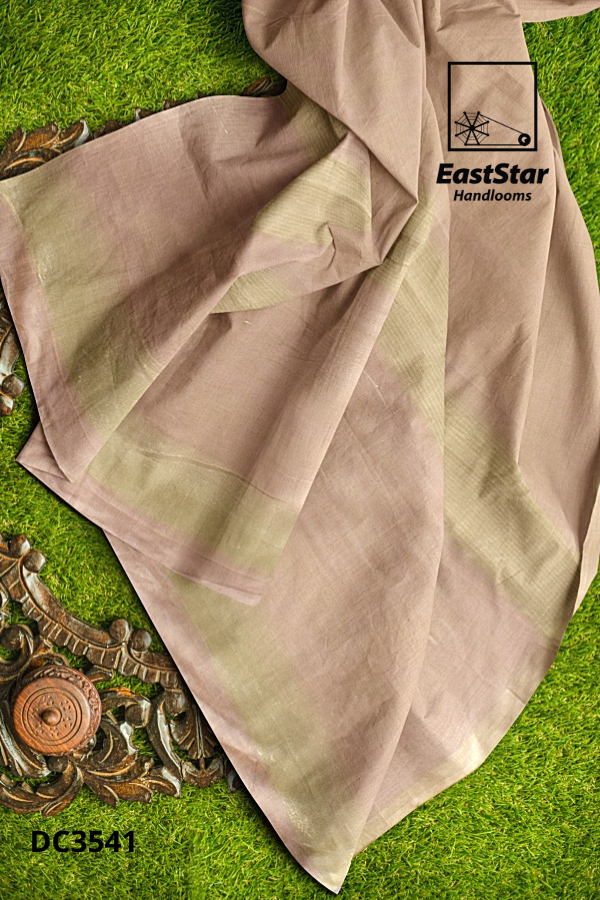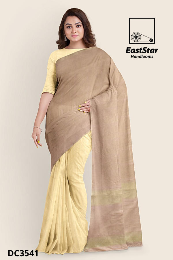 Discover the Pastel yellow taupe pallu handloom sari by EastStar Handlooms, DC3541—an artful two tone handloom sari that pairs serene pastel yellow with a soft sheen taupe pallu. Handcrafted with a faint woven texture, the muted taupe-brown pallu flows over neat front pleats, finished with understated olive-gold and taupe bands, while the matching half sleeve blouse and round neckline keep the silhouette timeless. Graceful, versatile, and photo ready, this handloom pastel yellow taupe sari drapes beautifully for daytime rituals and evening gatherings alike. Buy handloom pastel yellow sari today, Order two tone handloom sari from EastStar Handlooms, or Buy taupe pallu handloom sari to complete your refined wardrobe; the perfect handloom sari with taupe pallu awaits.
