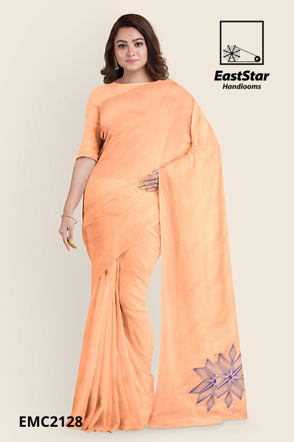 Glow in understated elegance with EastStar Handlooms EMC2128, a solid color peach sari handloom-crafted for a fluid drape and day-to-night grace. The traditionally pleated silhouette pairs with a matching blouse featuring chic elbow-length sleeves, while a striking geometric pallu motif—an artful star of overlapping diamonds—adds modern allure to this peach sari with blouse. Perfect for festive gatherings, workwear polish, or intimate celebrations, this geometric pallu sari from EastStar Handlooms balances timeless minimalism with a statement finish. Buy this peach orange solid sari now—if you seek a peach sari geometric pallu, order this peach sari elbow sleeve blouse set and own effortless sophistication.