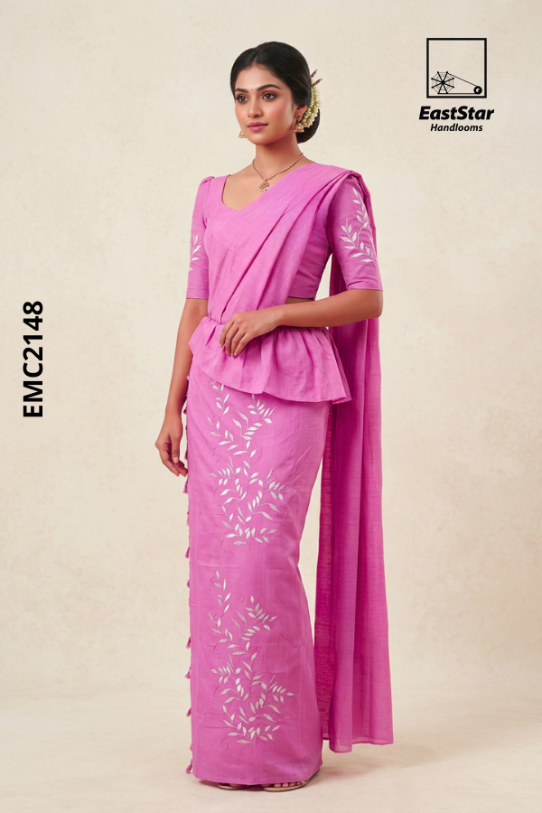 This elegant saree is a beautiful pink handloom piece designed with a soft, breathable fabric that offers both comfort and a premium look. It features delicate white leaf embroidery patterns gracefully placed along the lower drape, adding a subtle yet classy contrast to the vibrant base color. The saree is styled in traditional Sri Lankan Kandyan (Osariya) fashion, highlighted by a structured waist frill and a neatly draped single pallu that enhances the overall silhouette. It is paired with a perfectly fitted matching blouse that includes minimal embroidery on the sleeves, maintaining a refined and balanced appearance. Ideal for festive occasions, cultural events, or elegant day wear, this saree reflects timeless charm with a modern, sophisticated touch