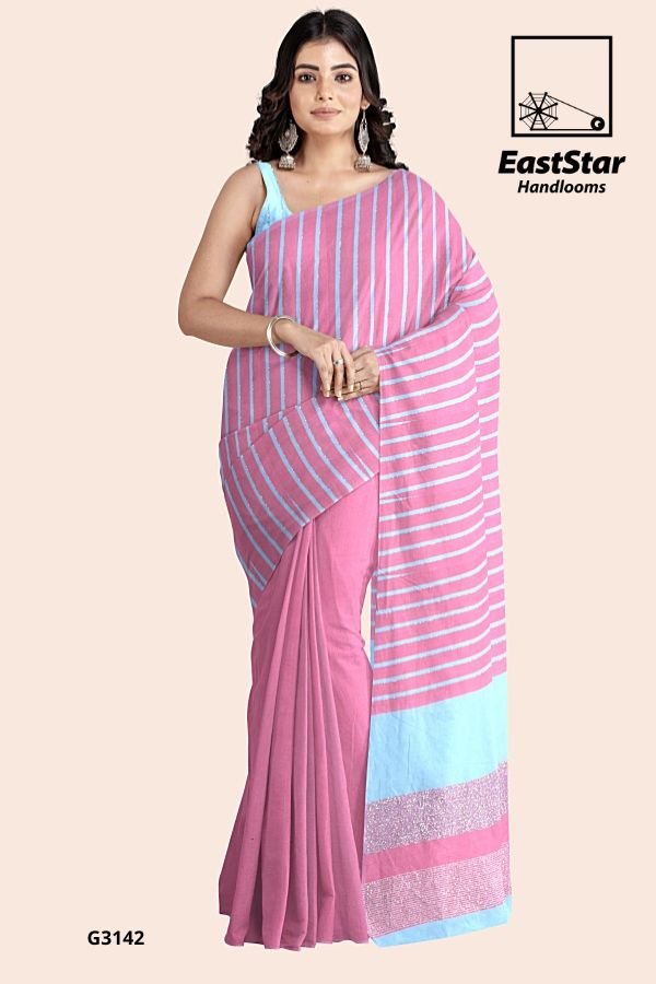 Embrace elegance with our stunning Pink and Blue Sari. Crafted with exquisite ornamental detailing, this designer striped pink sari seamlessly blends traditional craftsmanship with contemporary style. The alternating pink and light blue sections adorned with intricate ornaments make it a perfect choice for any special occasion. Order your elegant pink sari with blue stripes online today and experience timeless beauty and sophistication.