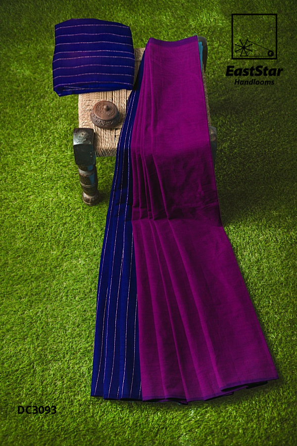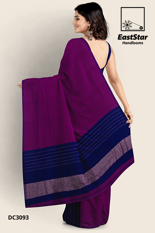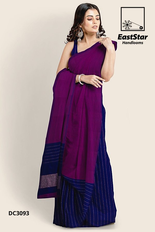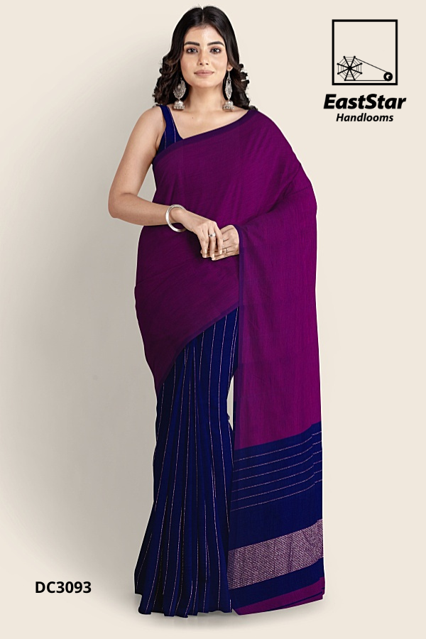 Unveil yourself in the exquisite elegance of the EastStar Handlooms\’ Deep Purple Saree DC3093. This stylish saree, predominantly deep purple with dynamic blue pleats, epitomizes grace and sophistication. The vertical stripes on the pleats add a lively pattern, ensuring you stand out with every step. The plain deep purple pallu, elegantly draped over the shoulder, complements your silhouette. Paired with large silver earrings and a bangle, this ensemble radiates timeless charm. Perfect for any occasion, this vibrant purple and blue saree is your pathway to sheer elegance. Don\’t miss the chance to own this masterpiece — buy your deep purple saree online today!