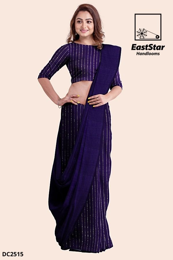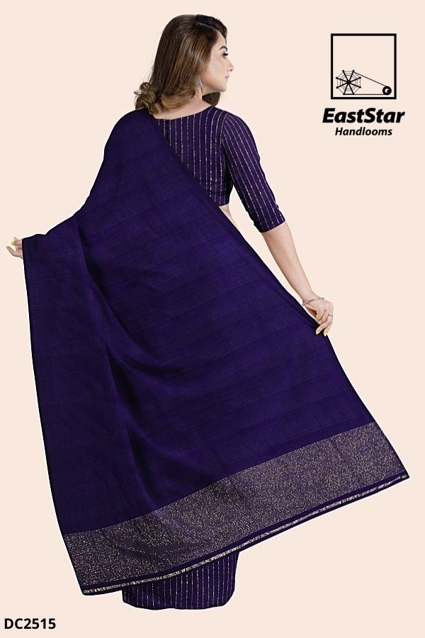 Exude elegance in the Deep Purple Shimmer Saree, a blend of charm and class. This masterpiece with a patterned texture and striking shimmering details along its borders is sure to turn heads. Marvel at the graceful vertical lines that add a touch of sophistication to its rich fabric. Match it with the included blouse adorned with shimmering lines, carrying the theme beautifully through. The saree\’s synergy with the matching blouse offers a harmonious ensemble that transcends traditional fashion. Order this elegant shimmering purple saree online and embrace the timeless panache that is the essence of this beautiful garment. For the fashion-forward woman who appreciates the sophistication and charm of a deep purple saree matching blouse. Purchase this shimmering bordered purple saree and get wrapped up in its allure.