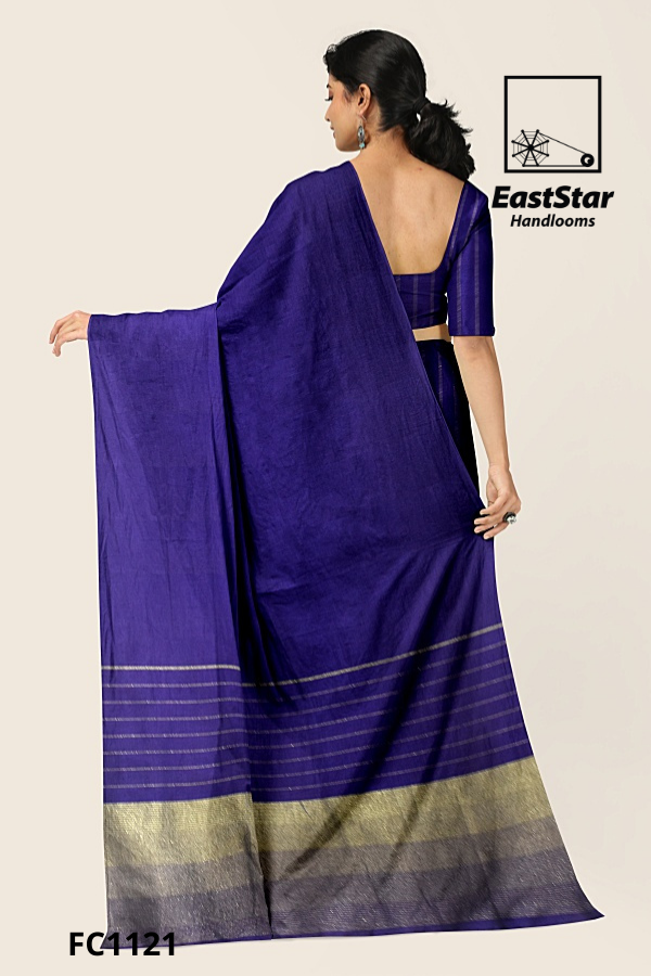 Meet EastStar Handlooms FC1121, a plain handloom saree in luminous purple that shifts to deep purple, finished with delicate metallic lines and a wide olive-toned gold–silver hem. The fluid pallu and darker vertical pleats sculpt an elegant silhouette, making this purple metallic border saree EastStar Handlooms a refined choice from rituals to receptions. If you seek a deep purple plain handloom saree with a statement olive metallic hem border, this metallic border plain saree is your modern classic. Buy purple handloom saree, Order olive gold hem saree, and own the glow of a gold silver hem saree crafted by EastStar Handlooms.