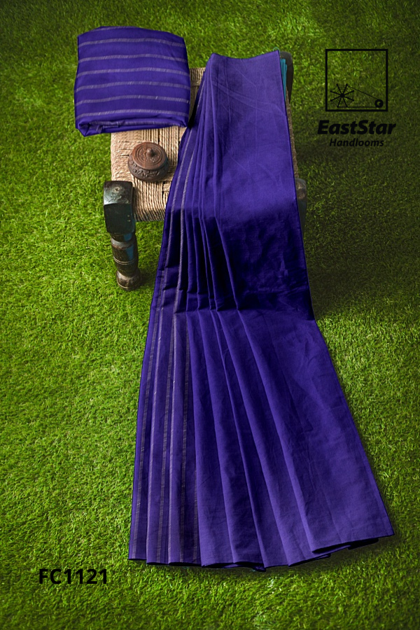 Fabric Pure Cotton Length and Width 6.15 Meters, 1.19 meters Blouse Piece 1 meter in purple with gold stripes Weave style Handwoven Description East Star presents this airy and lightweight Handlooms saree for those special occasions. This natural fabric settles around you as if they are part of your own skin. This Coffee Blue & Grey Combination and woven for those who have a classy taste