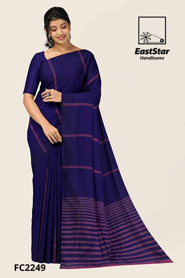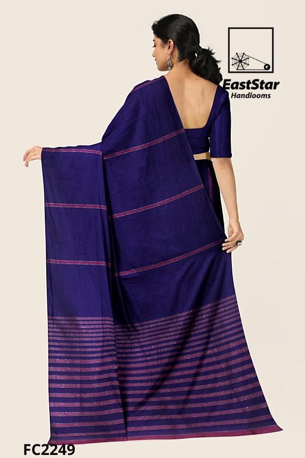 Drape yourself in quiet power with EastStar Handlooms FC2249, a dark indigo handloom saree enriched with deep purple hues. Fine magenta lines trace a graceful grid across the body, while the magenta striped pallu unfurls in dense, artisanal bands—this magenta striped pallu saree from EastStar Handlooms is striking, sophisticated, and unmistakably refined. Handwoven for fluid drape and enduring comfort, this indigo saree with striped pallu pairs beautifully with statement earrings and rings, elevating every celebration or boardroom moment. Buy dark indigo handloom saree from EastStar Handlooms—order this purple saree with magenta stripes today; discover FC2249 and buy indigo saree striped pallu to complete your timeless collection.