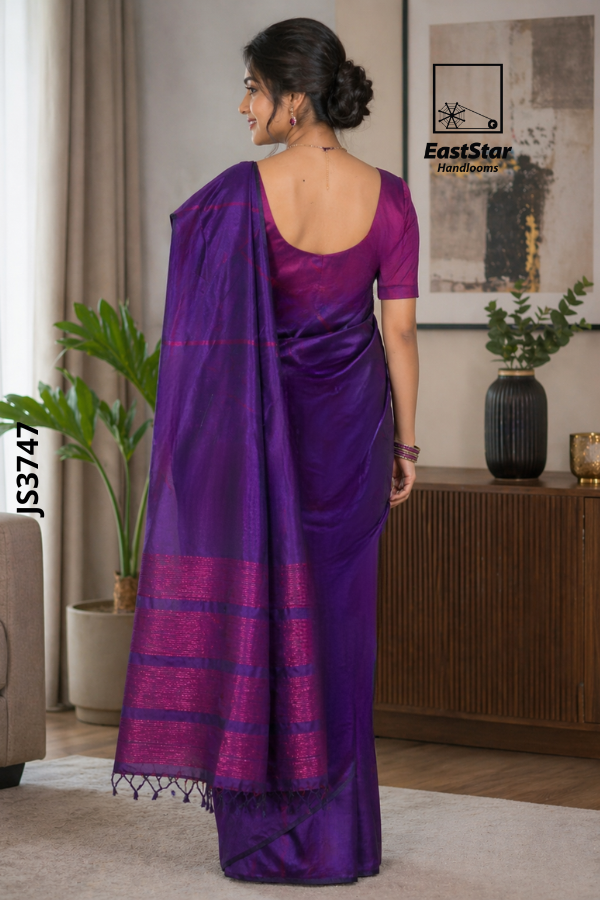 This elegant handloom saree features a rich deep purple base with subtle magenta undertones, giving it a luxurious and vibrant appearance. The fabric has a smooth, slightly lustrous texture that reflects the beauty of traditional weaving, enhanced by fine woven lines running across the body for a refined look. The pallu stands out with striking magenta detailing and horizontal woven patterns, finished with delicate tassels that add a graceful touch. Paired with a matching purple blouse, this saree creates a perfectly coordinated and sophisticated ensemble, ideal for festive occasions, formal gatherings, or elegant day wear