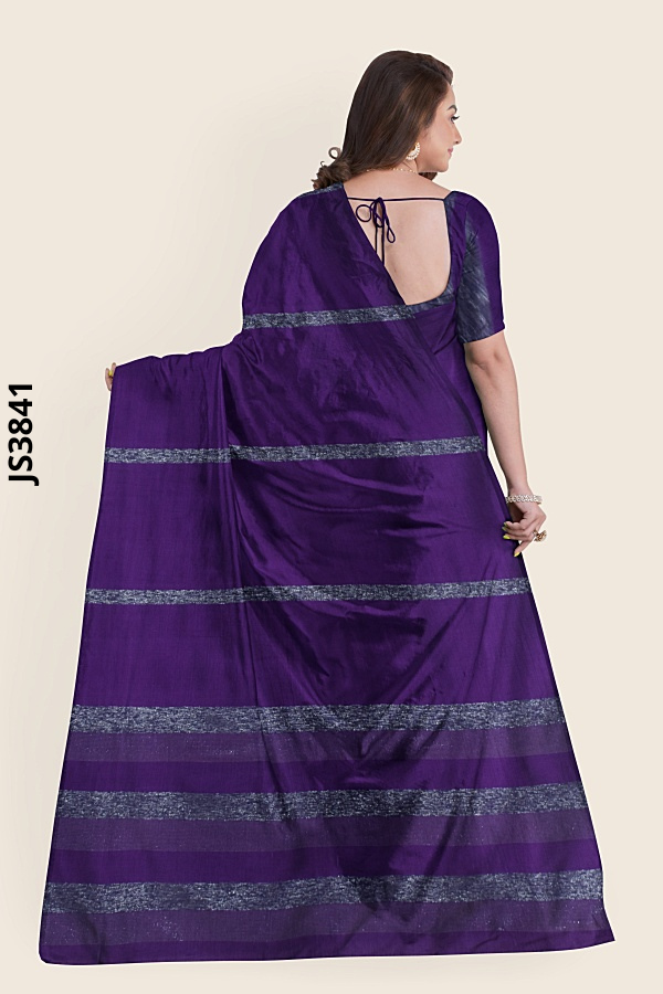 Meet the JS3841 deep purple striped saree—an opulent drape with a luminous, elegant sheen designed to turn every entrance into a moment. Its smooth, light-sheen fabric flows in a classic drape pleated saree silhouette, while the pallu glows with horizontal, speckled silver gray stripes; think a silver gray bordered pallu saree that captures light with every step. From cocktail parties to festive evenings, this JS3841 elegant sheen party saree elevates your style as a deep purple saree with stripes—polished, timeless, and effortlessly flattering. Buy deep purple striped saree now to own the definitive silver gray pallu saree; Order silver gray pallu saree and shine in our JS3841 silver-gray pallu stripe saree, the elegant sheen party wear saree everyone is talking about—Buy elegant sheen party saree today.