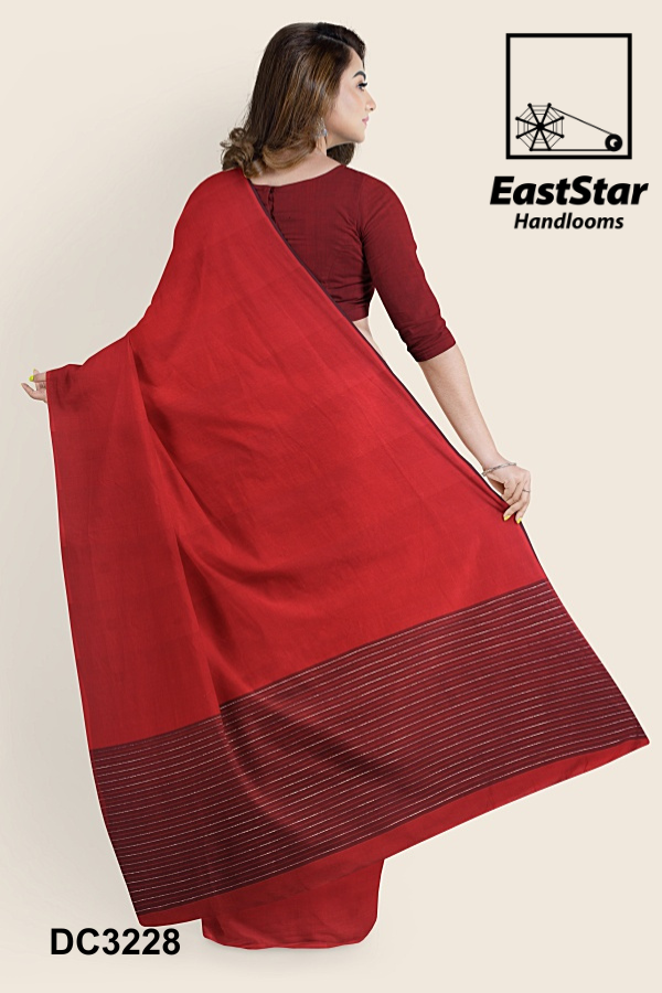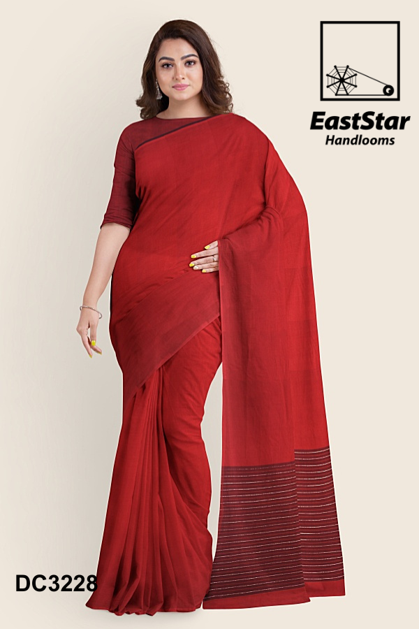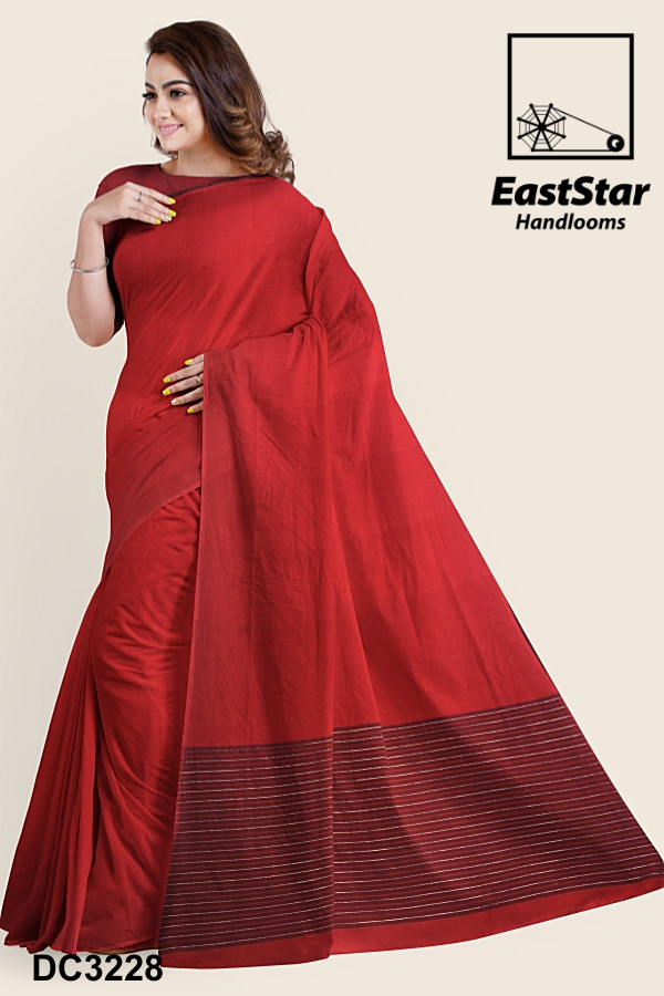 Embrace the essence of elegance with the EastStar Handlooms DC3228 saree, a masterpiece in solid red that exudes grace and charm. Crafted from the finest handloom fabric, its subtle texture speaks volumes of luxury and sophistication. The saree\’s standout feature, the horizontal white striped border, adds a touch of classic beauty, making it perfect for any occasion. With its timeless appeal, the DC3228 saree is more than just a piece of clothing; it\’s a statement of refined taste. Discover how the rich hue complements your aura by ordering this exquisite solid red saree online today and redefine your sartorial style with every drape.