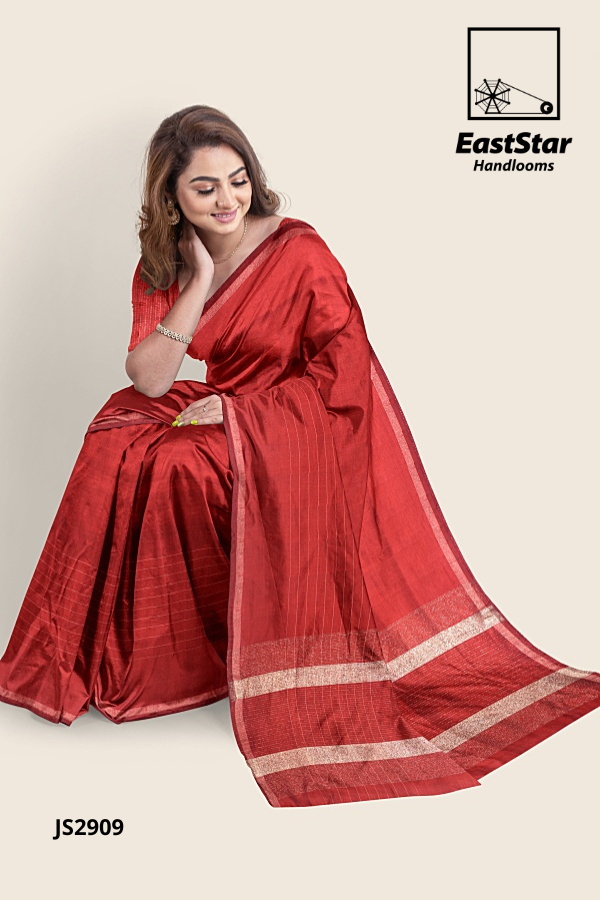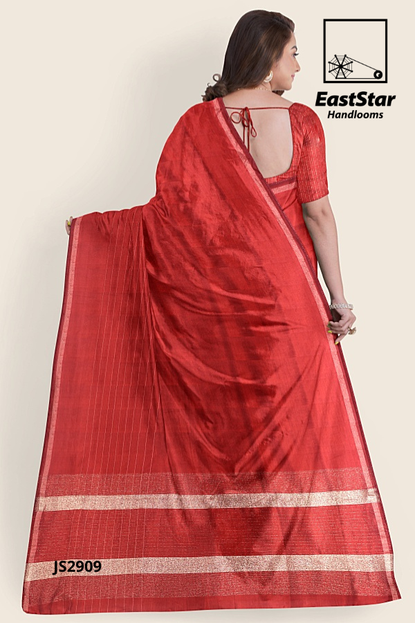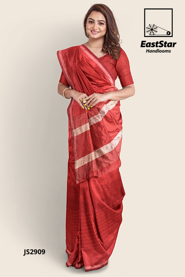 Step into timeless elegance with the exquisite red saree from EastStar Handlooms. This masterpiece, code JS2909, adorns you with shimmering golden patterns and a regal gold border, making it an irresistible choice for any traditional occasion. The rich texture and captivating sparkle elevate your style, while the subtle textured blouse complements the overall allure. Perfectly crafted for those special moments, this saree combines artistry with grace, inviting you to embrace the rich heritage of traditional fashion. Indulge in luxury and buy your dream saree online today, and let its charm become a part of your story.