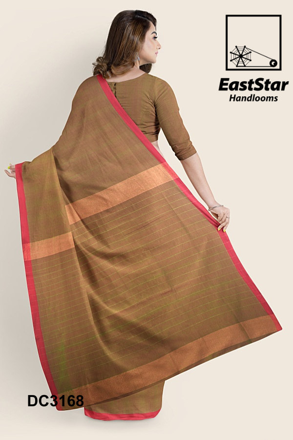 Embrace timeless elegance with the EastStar Handlooms Reddish Green Saree. This handcrafted masterpiece, featuring a striking red border, is a testament to the rich tradition of weaving. The saree\’s subtle horizontal lines whisper sophistication, making it a perfect fit for any event. Paired with a touch of yellow nail polish, it adds a splash of modern vibrance. Complete the look with a delicate bracelet, and transform your ensemble into an artful expression. Elevate your style with this elegant saree, available now for purchase online. Experience the luxury of tradition and the beauty of personalized craftsmanship. Order your handwoven saree today and redefine elegance.