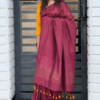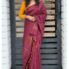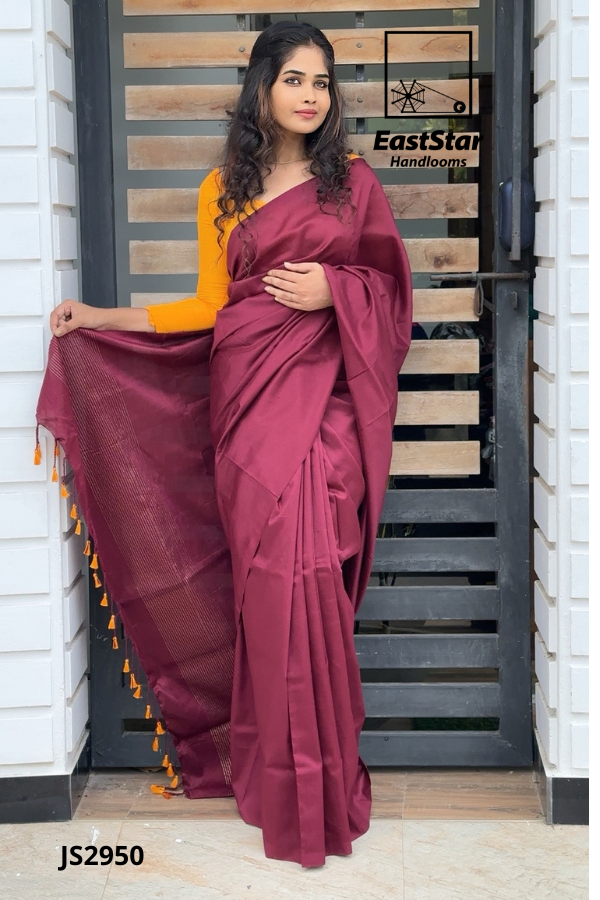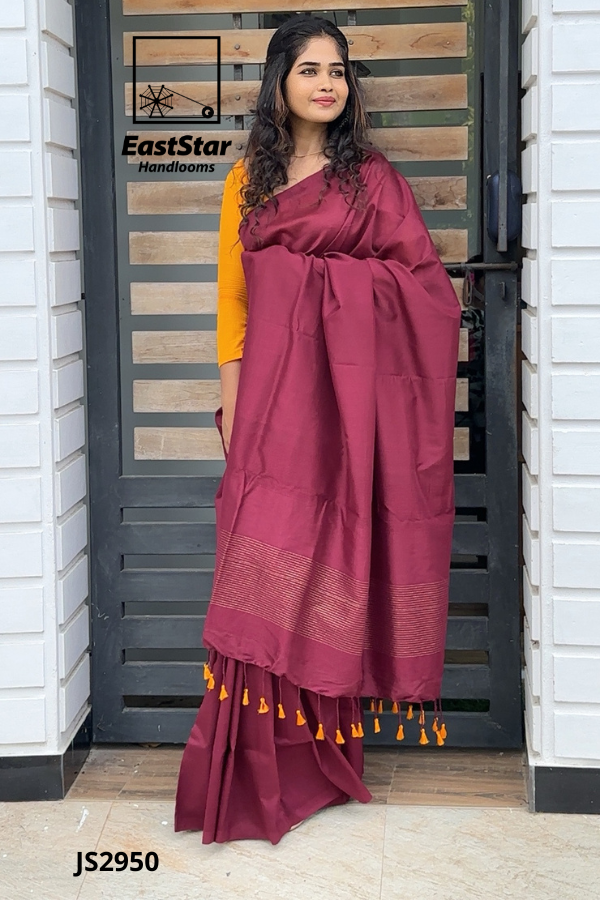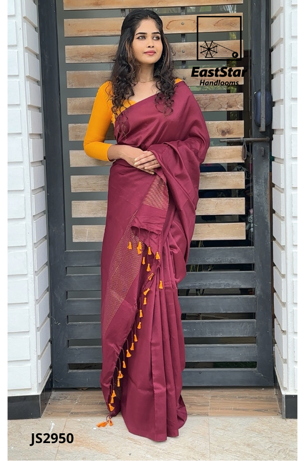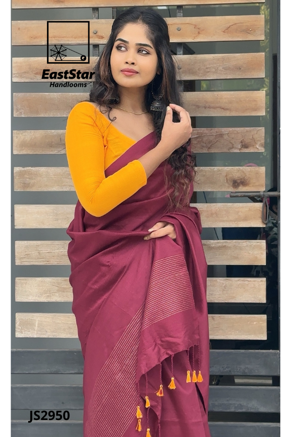 Step into timeless elegance with the EastStar Handlooms JS2950 saree. This exquisite ensemble features a rich maroon saree adorned with subtle decor and charming orange tassels at the bottom. Paired perfectly with a mustard yellow, three-quarter sleeve blouse, it offers a stunning contrast that highlights your grace. Crafted to perfection, this traditional saree set is for the modern woman who appreciates heritage with a touch of contemporary style. Buy this magnificent maroon saree and mustard blouse combo online today and elevate your wardrobe.