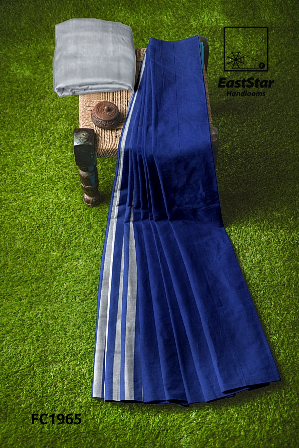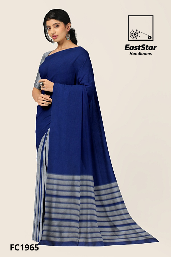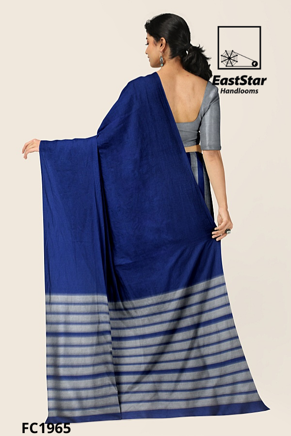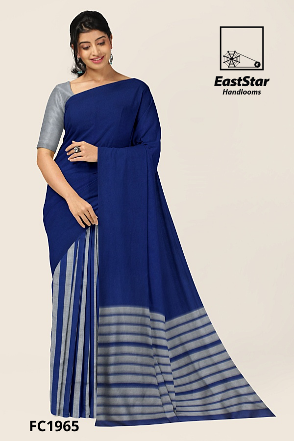 Elevate your elegance with FC1965, the Royal blue silver striped sari EastStar Handlooms customers love—handwoven in deep navy with a lustrous silver-gray pallu and bold, blue-edged stripes. This Navy blue handloom sari EastStar FC1965 features a solid body, front pleats in alternating blue and silver-gray, and a graceful, striped pallu that frames every movement. Pairing a short-sleeved silver blouse with a Blue sari silver border EastStar finish, it delivers a timeless, regal glow—perfect for weddings, festivities, and standout evenings. Buy royal blue striped sari and experience the allure of a blue silver striped sari and navy blue striped pallu sari; Order navy blue handloom sari today to own a royal blue silver bordered sari with handloom blue sari silver stripes from EastStar Handlooms.