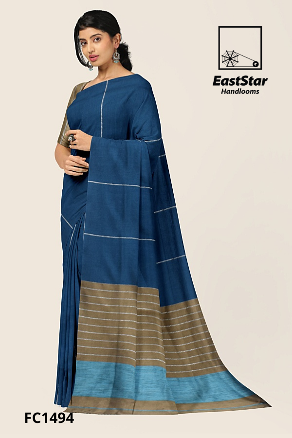 Fabric Pure Cotton Length and Width 6.15 Meters, 1.19 meters Blouse Piece 1 meter in olive gold with silver stripes Weave style Handwoven Description East Star presents this airy and lightweight Handlooms saree for those special occasions. This natural fabric settles around you as if they are part of your own skin. This Coffee Blue & Grey Combination and woven for those who have a classy taste