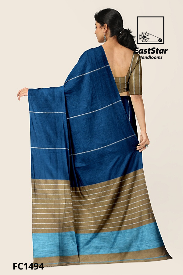 Discover timeless elegance with this royal blue handloom saree from EastStar Handlooms, its deep indigo body lit by delicate silver pinstripes. A wide olive-gold border detailed with fine silver stripes finishes in a sky-blue edged hem, while the silver striped pallu forms subtle geometric rectangles for a poised, modern allure. Paired with a metallic olive-gold blouse with silver pinstripes, this olive gold bordered handloom saree drapes beautifully for weddings, soirees, and boardrooms alike. Buy royal blue handloom saree, Order olive gold border saree, or Buy silver striped pallu saree from EastStar Handlooms today and make every entrance unforgettable.