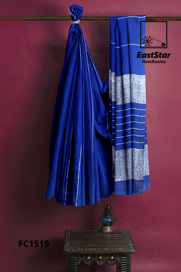 Elevate your wardrobe with Royal blue saree EastStar Handlooms FC1519, a handloom masterpiece that radiates timeless poise. Its woven body glimmers with fine silver white lines, and the silver striped pallu unfolds into horizontal accents with two wide metallic silver panels, framed by a minimalist blue border and paired with a matching sleeveless V-neck blouse. This royal blue striped handloom saree drapes beautifully for weddings, festivities, and power dressing alike, delivering the refined texture of an authentic handloom blue sari and the modern allure of a royal blue woven saree. Buy royal blue handloom saree now—order a royal blue pallu saree with a metallic pallu and royal blue saree silver stripes from EastStar Handlooms, and buy blue saree silver stripes that turns every step into a statement.