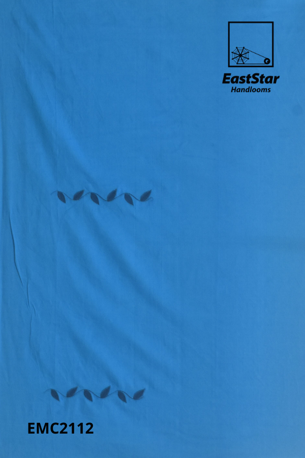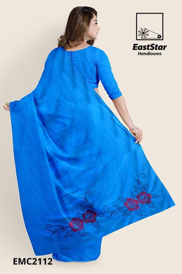 Elevate every occasion with the luminous Royal Blue Sari from EastStar Handlooms, code EMC2112—a solid blue sari with blouse that drapes like a dream, the Royal blue sari EastStar Handlooms made to turn heads. The pallu unveils a refined floral story: a blue sari rose motif with two red roses, leafy accents, and a graceful vine, making this royal blue floral sari irresistibly modern. Finished with a matching elbow-sleeve blouse, this royal blue sari floral pallu design flatters effortlessly from daytime festivities to evening celebrations. Buy royal blue floral sari and Order solid blue sari blouse from EastStar Handlooms now; if you seek Royal blue floral pallu sari EastStar Handlooms or Royal blue sari EMC2112 EastStar Handlooms, choose this standout solid blue sari with roses—your elegant answer to Buy blue sari rose motif and royal blue sari with blouse.
