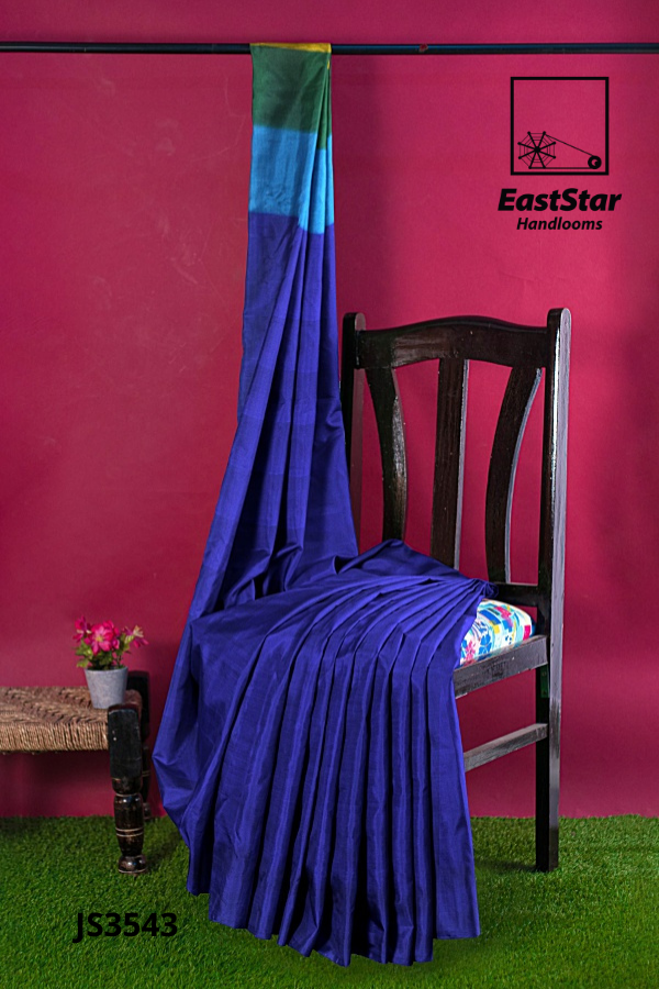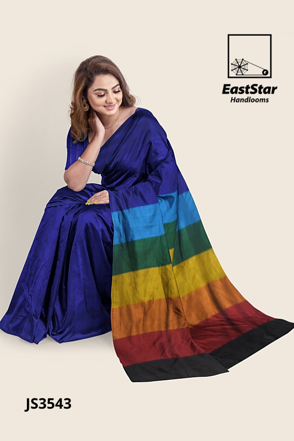 Elevate every occasion with the Royal Blue Saree from EastStar Handlooms (JS3543)—a royal blue handloom saree crowned with a radiant rainbow pallu in dark blue, teal, green, yellow, orange, red, and a bold black edge. Meticulously woven for a fluid drape and crisp pleats, this rainbow pallu handloom saree—a blue handloom saree with a striped, multicolor pallu—flatters every silhouette and feels feather-light from day to night. From weddings and festivals to polished office days, its deep blue saree multicolor pallu brings modern artistry to timeless grace—pair it with minimal jewelry and let the colors speak. Order the Rainbow Pallu Saree by EastStar Handlooms now—buy your royal blue handloom saree, order this blue saree with rainbow pallu, and buy the multicolor pallu blue saree in one stunning piece: Blue Saree EastStar JS3543.