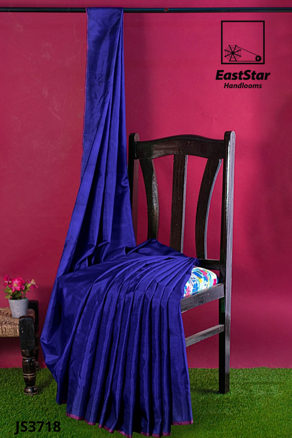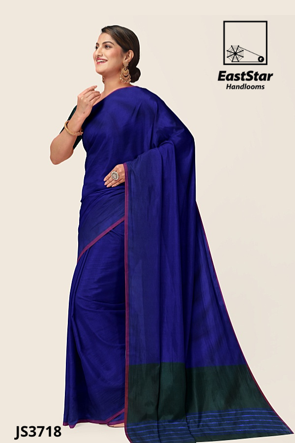 Introducing EastStar Handlooms JS3718, a royal blue traditional saree crafted to glow with timeless grace. Its rich royal blue body, traced with a slim wine-magenta border, flows into a sweeping dark green pallu finished with delicate horizontal blue stripes for a poised, regal fall. Neatly arranged pleats and an easy drape flatter every silhouette, perfect for weddings, festivals, and memorable celebrations; style it with a dark green blouse and statement jewelry for luminous elegance. Buy this Royal blue saree EastStar Handlooms favorite now – the blue saree with green pallu and magenta edged blue saree you will treasure; order the blue green border saree EastStar Handlooms JS3718 today.